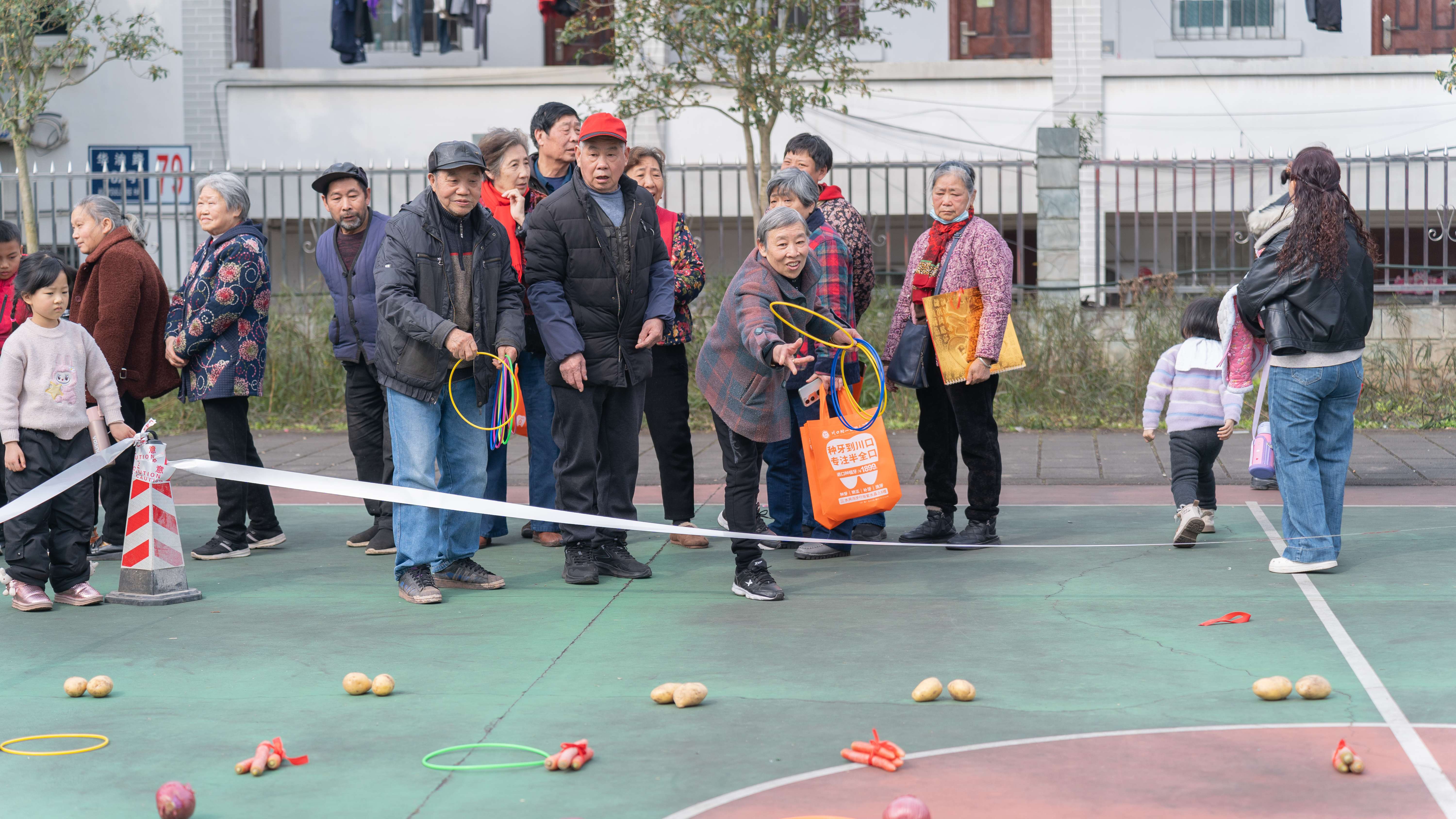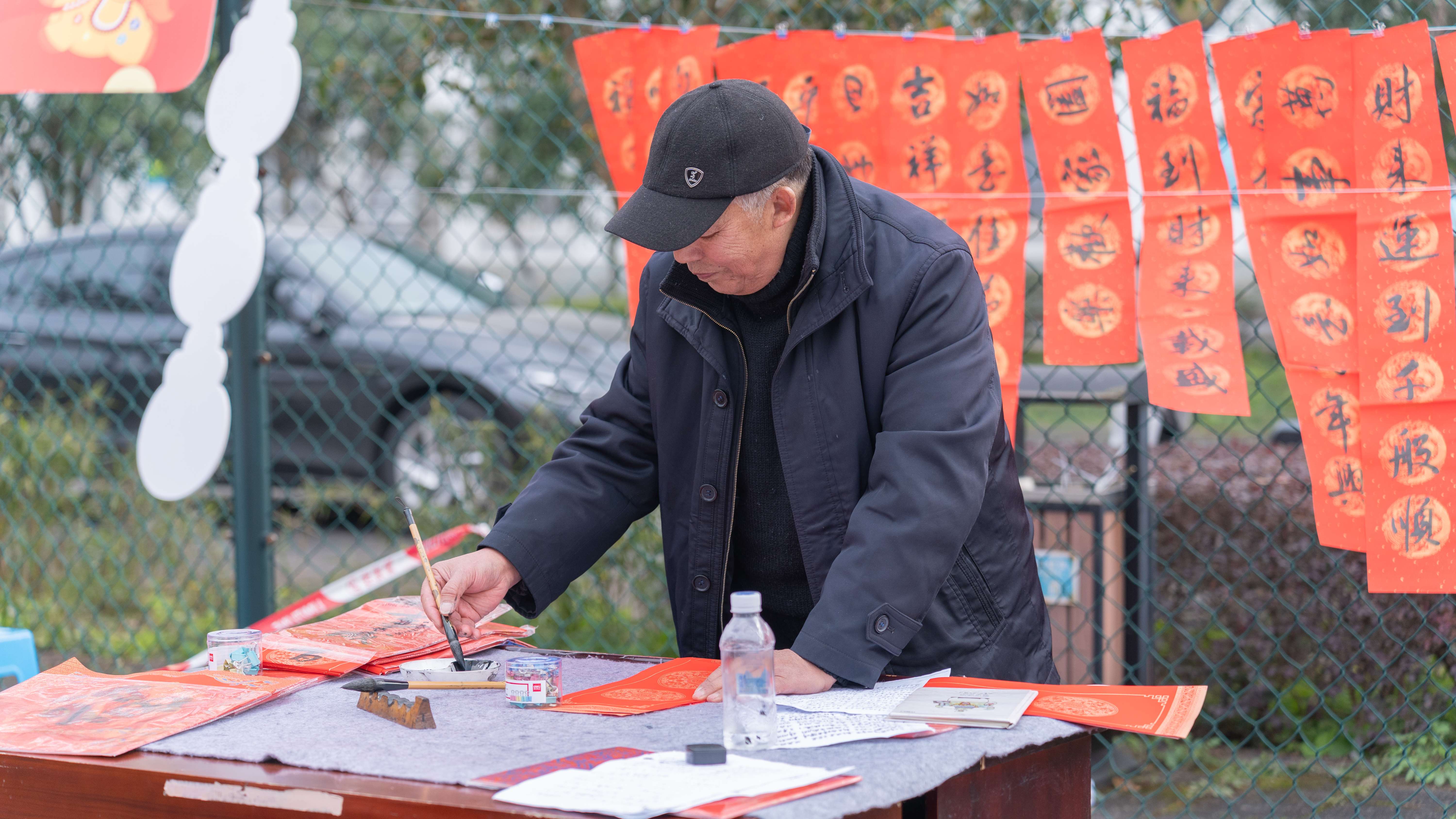 来到活动现场,静和苑小区桂花广场内热闹非凡。套圈游戏的场地里,盐、酱油、蔬菜等百货陈列在地,居民们扔圈套取,玩得不亦乐乎。一旁有专门的书法老师撰写春联,只需划拳赢取,便可收获一幅暖心吉祥的春节对联。除此之外,现场还设有新春汤圆分享会,居民们围坐在一起,品尝着新鲜包取的饺子、汤圆,感受着春节的浓浓氛围。