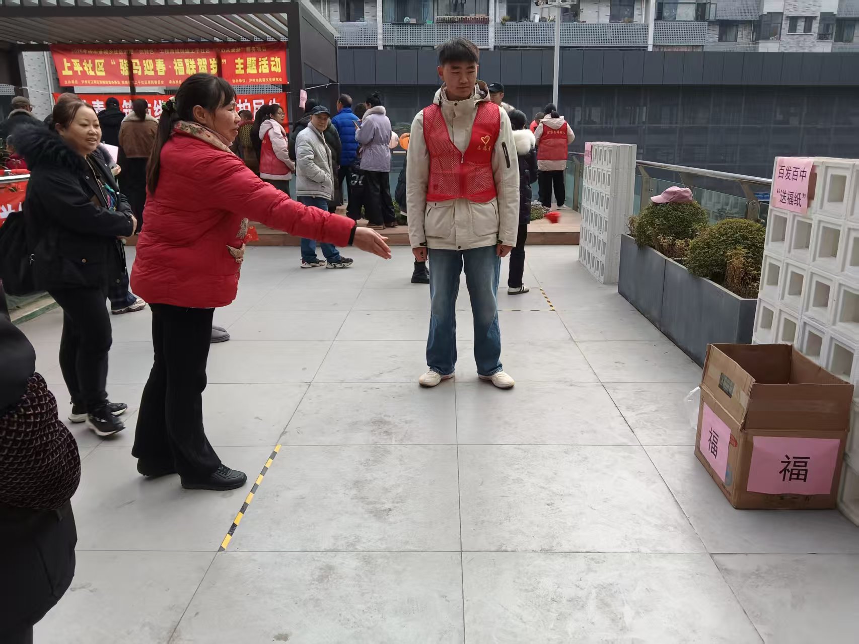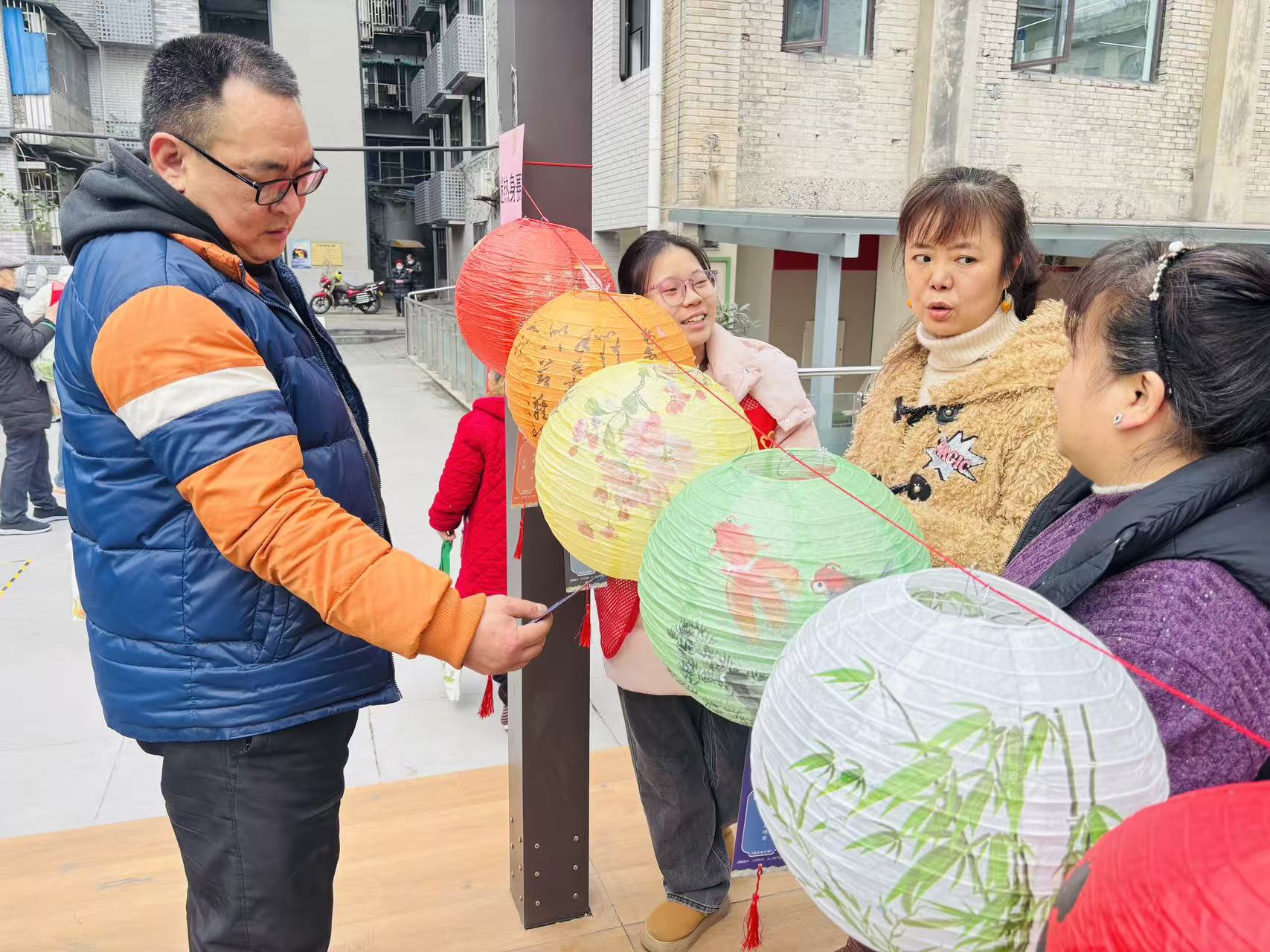 互动游戏区同样充满欢声笑语。“灯谜热身赛”前,居民们或凝神思考,或相互讨论,在传统谜语的智慧中感受文化趣味;“百发百中送福纸”“蒙眼敲锣”等游戏则吸引了许多亲子家庭和年轻人参与,大家在轻松愉快的比拼中传递祝福、增进情谊,现场掌声、笑声、喝彩声不绝于耳。