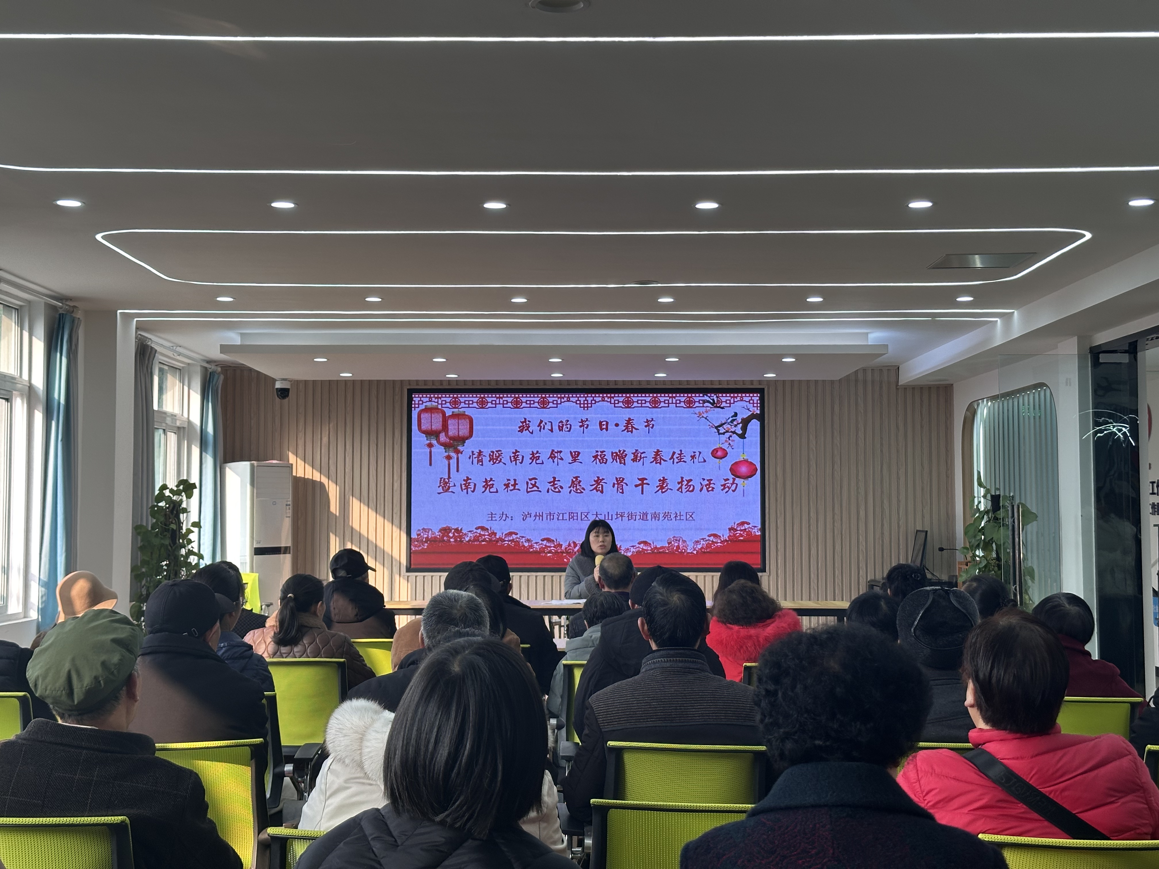 新春将至,暖意渐浓。近日,泸州市江阳区大山坪街道南苑社区“我们的节日·春节——情暖南苑邻里 福赠新春佳礼暨志愿者骨干表扬活动”在社区会议室温情启幕,现场座无虚席,社区工作人员与志愿者们欢聚一堂,共话奉献,喜迎新春。