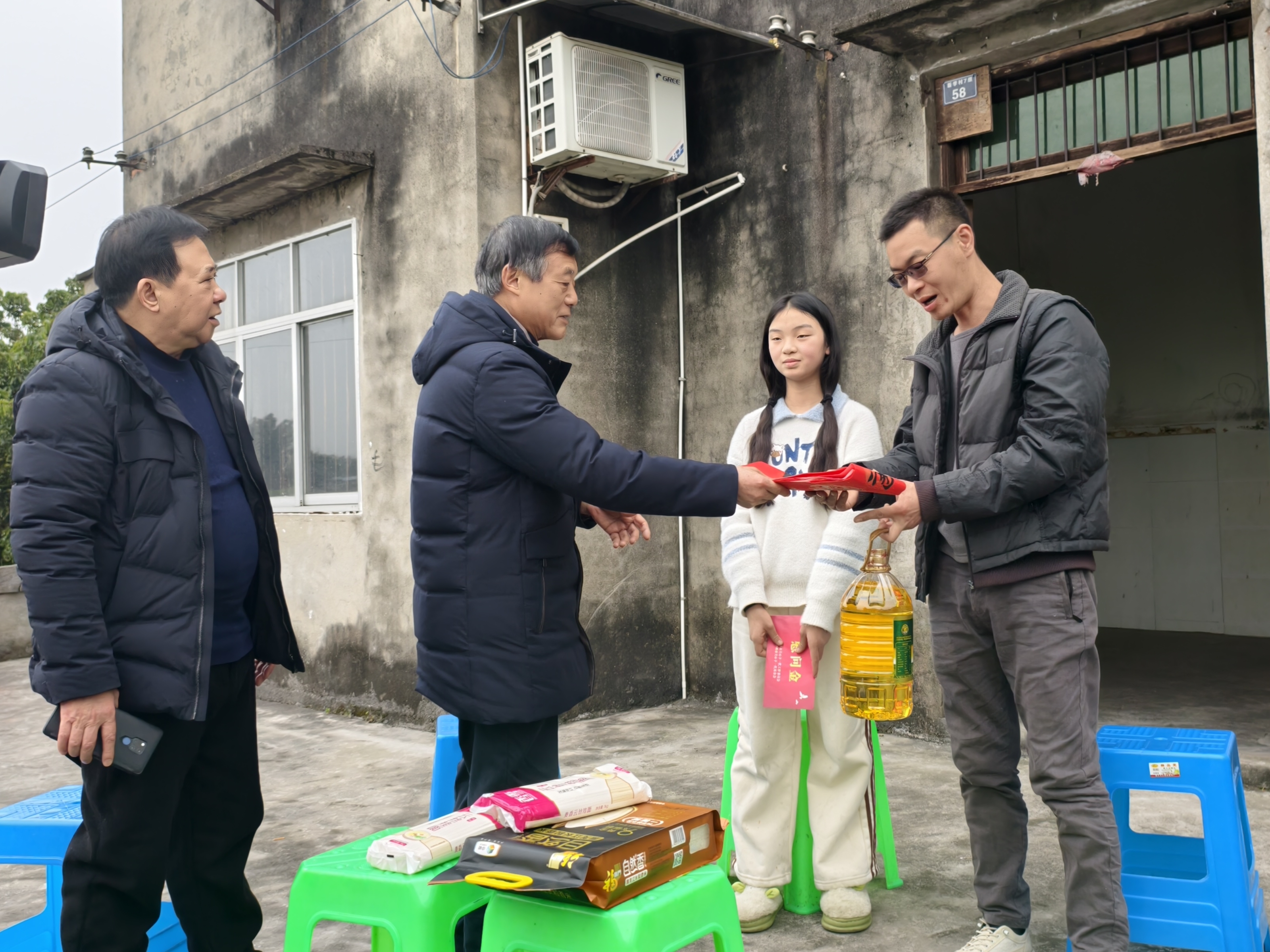 慰问现场,慰问组为两名贫困学生送上生活物资及慰问金,将关爱精准送达学子心坎。此次活动秉持“走访到户、关爱到心”的理念,不仅为贫困学生送去物质帮扶,更给予精神慰藉,切实让孩子们感受到社会大家庭的温暖,助力他们安心度过寒冬、快乐成长。
