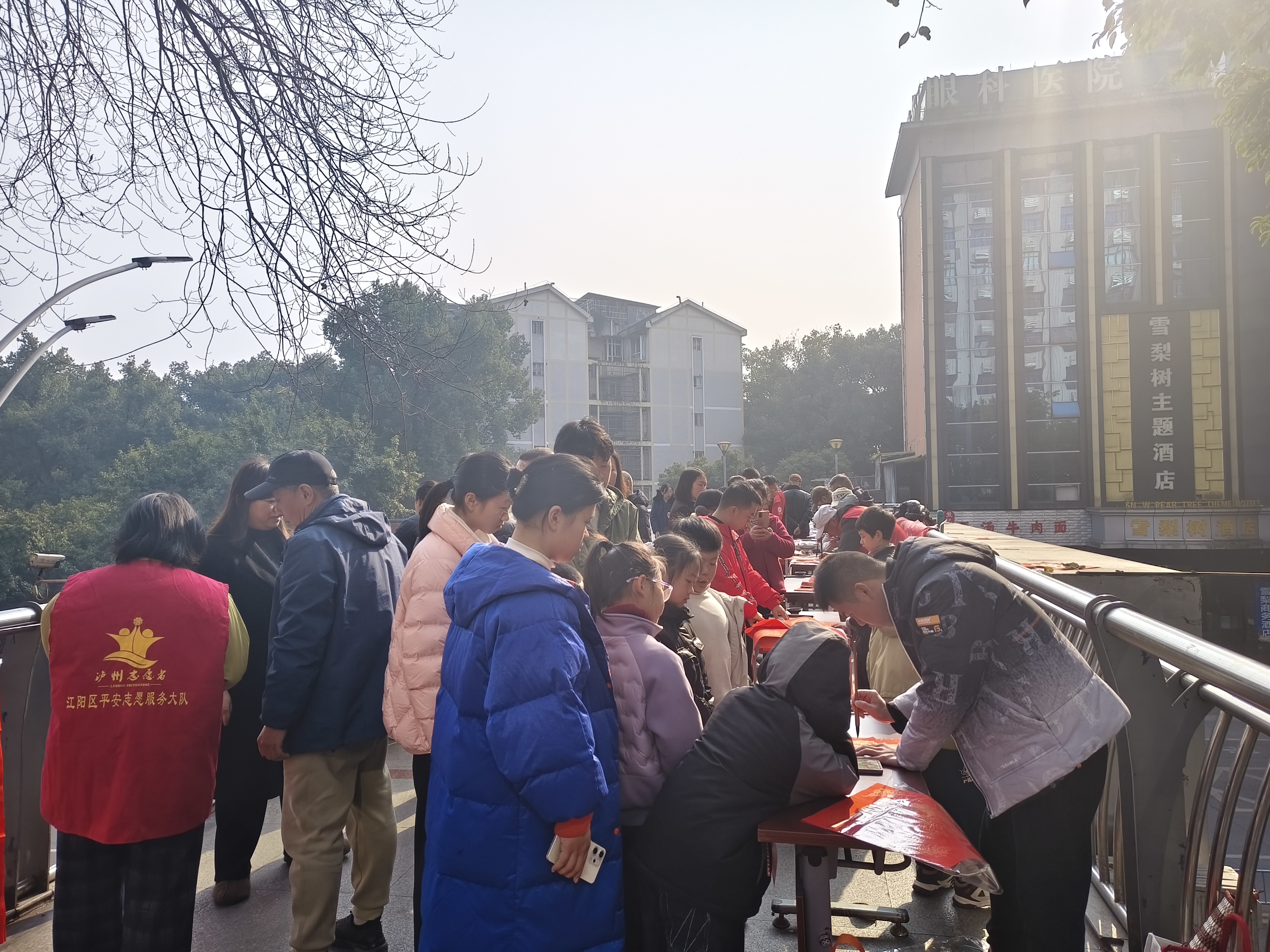 为弘扬中华优秀传统文化,营造喜庆祥和、风清气正的新春氛围,拉近社区与居民之间的距离,2月6日上午泸州市江阳区南城街道凤凰社区新时代文明实践站联合泸州老年大学、泸州徐浩美育、党员志愿者等开展“我们的节日.春节”—廉味春联送祝福,风清气正迎新春志愿活动,在凤凰山长起桥桥上为辖区居民书写春联、送福字、画年画、述廉洁、聚民意,用笔墨画传递温情,传递志愿服务正能量。