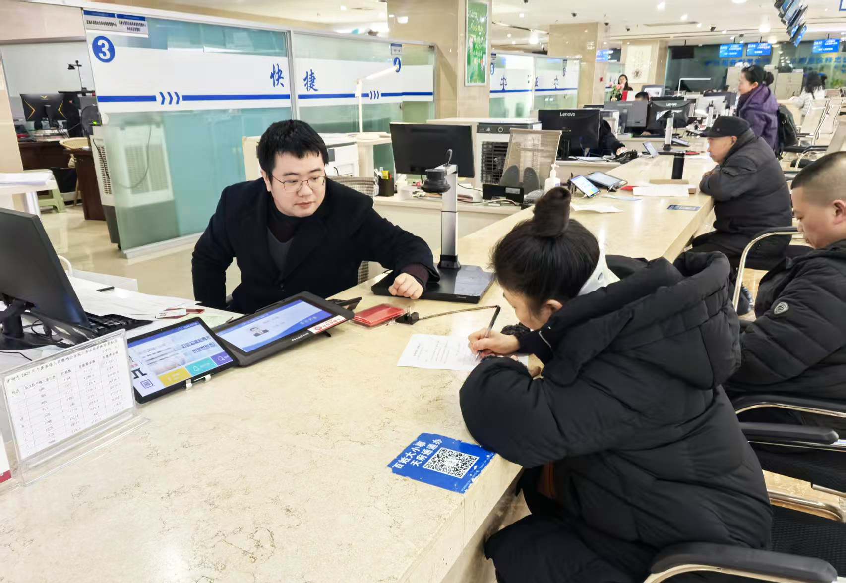 江潮讯(记者 张红)“今天办事的人虽多,但大厅及时增加了窗口,队伍流动特别快,全程都有工作人员耐心指导,还教会了我线上办理的方法。”2月9日,在江阳区政务服务中心人力社保窗口,趁工作间隙前来为家人咨询居民养老保险业务的市民李萍,对大厅高效贴心的服务点赞。