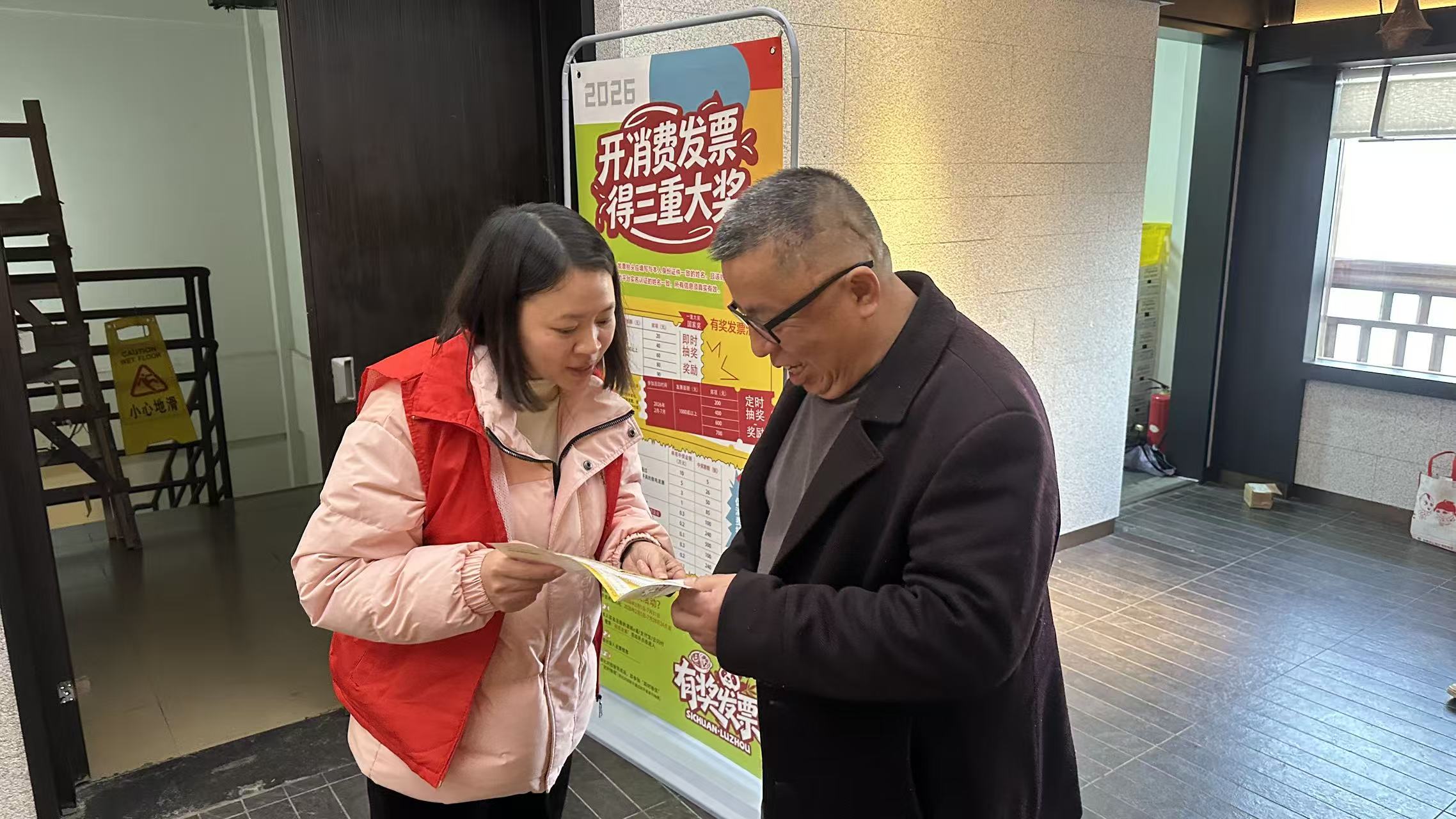 为了让发票抽奖活动精准对接年终消费热潮,华阳街道组织街社干部、志愿者,深入辖区商场超市、酒店民宿、餐饮娱乐等消费场所,通过发放宣传手册、张贴海报、现场讲解等多种方式,广泛宣传有奖发票活动的规则、奖项设置及兑奖流程等,确保活动信息家喻户晓、深入人心。同时,街道在江阳公园、市民广场、万象汇等十余个人流密集场所摆摊设点,通过“点对点”讲解、“面对面”演示的方式,向居民普及抽奖活动规则、参与方式,活动累计发放宣传折页6000余份,粘贴宣传海报5000余份,普及商家、居民近20000人次。