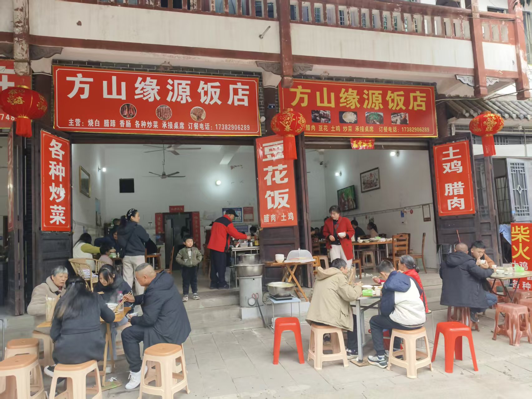 尤为火爆的是,方山场镇上的农家土菜馆,家家座无虚席,凭借招牌豆花、腊肉、凉拌土鸡等柴火慢炖的地道风味,成为市民游客的就餐首选,升腾的烟火气与食客的欢声笑语交织,将乡村新春的热闹氛围推向高潮。