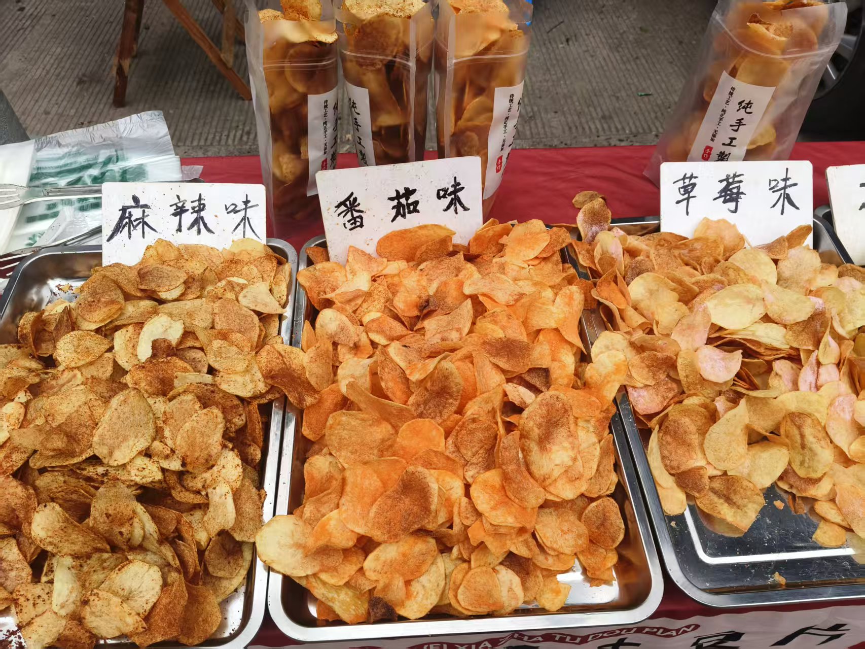 活动现场人气爆棚,60余家商家齐聚参展,往来市民游客络绎不绝,处处洋溢着喜庆热闹的新春氛围。非遗技艺与特色农产品展销区汇聚了方山腊肉、瓢梨酒、甘蔗红糖、黄粑等本地好物,以及新鲜蔬果、家禽蛋肉、菜籽油、农家苕粉等优质农产品,货真价实的乡土好物备受青睐。特色小吃区香气四溢,羊肉串、土豆片、鸡蛋饼、牛肉串等地道风味轮番上阵,鲜香扑鼻,引得游人驻足品尝。