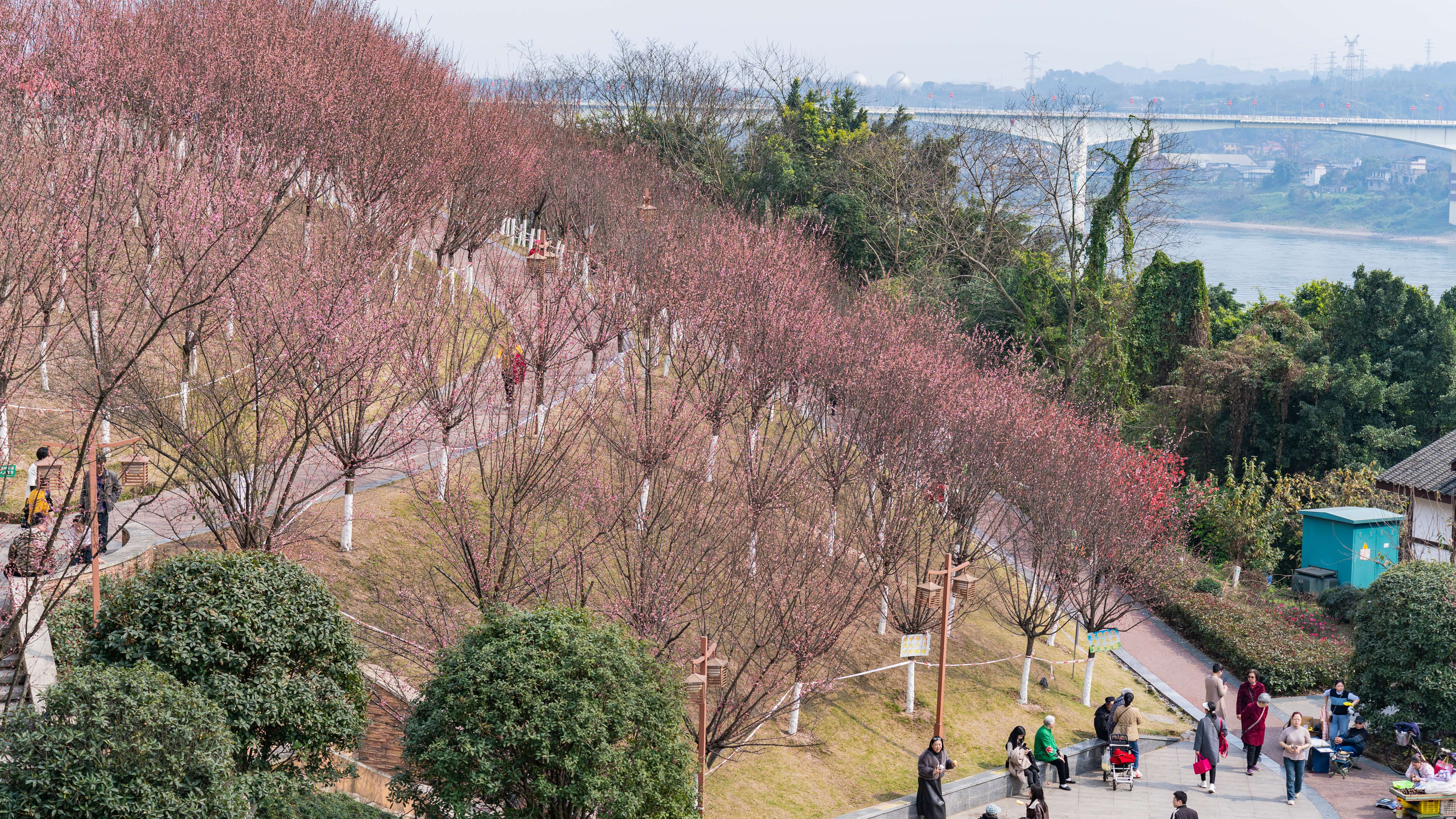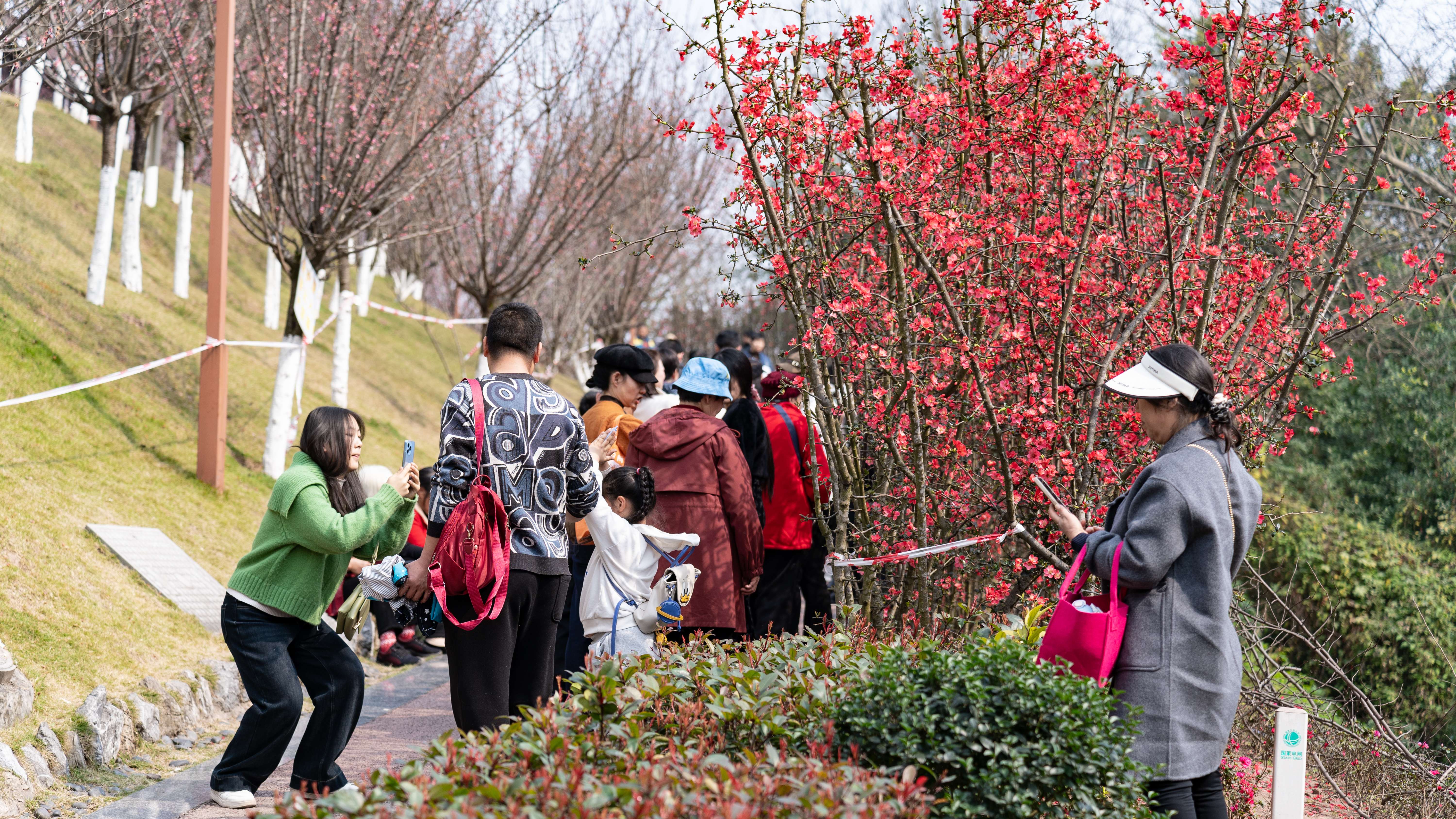 来到三道桥滨江公园,梅香阵阵中人声鼎沸。远远望去,满树梅花悬挂在枝头,如朝霞散彩,散发出沁人心脾的花香。红梅树下,前来游玩的市民正忙着拍照留念,不时传出阵阵笑声。不远处,商贩的吆喝、直播博主的解说、孩童的嬉笑交织在一起,绘成了春日的美好画卷。