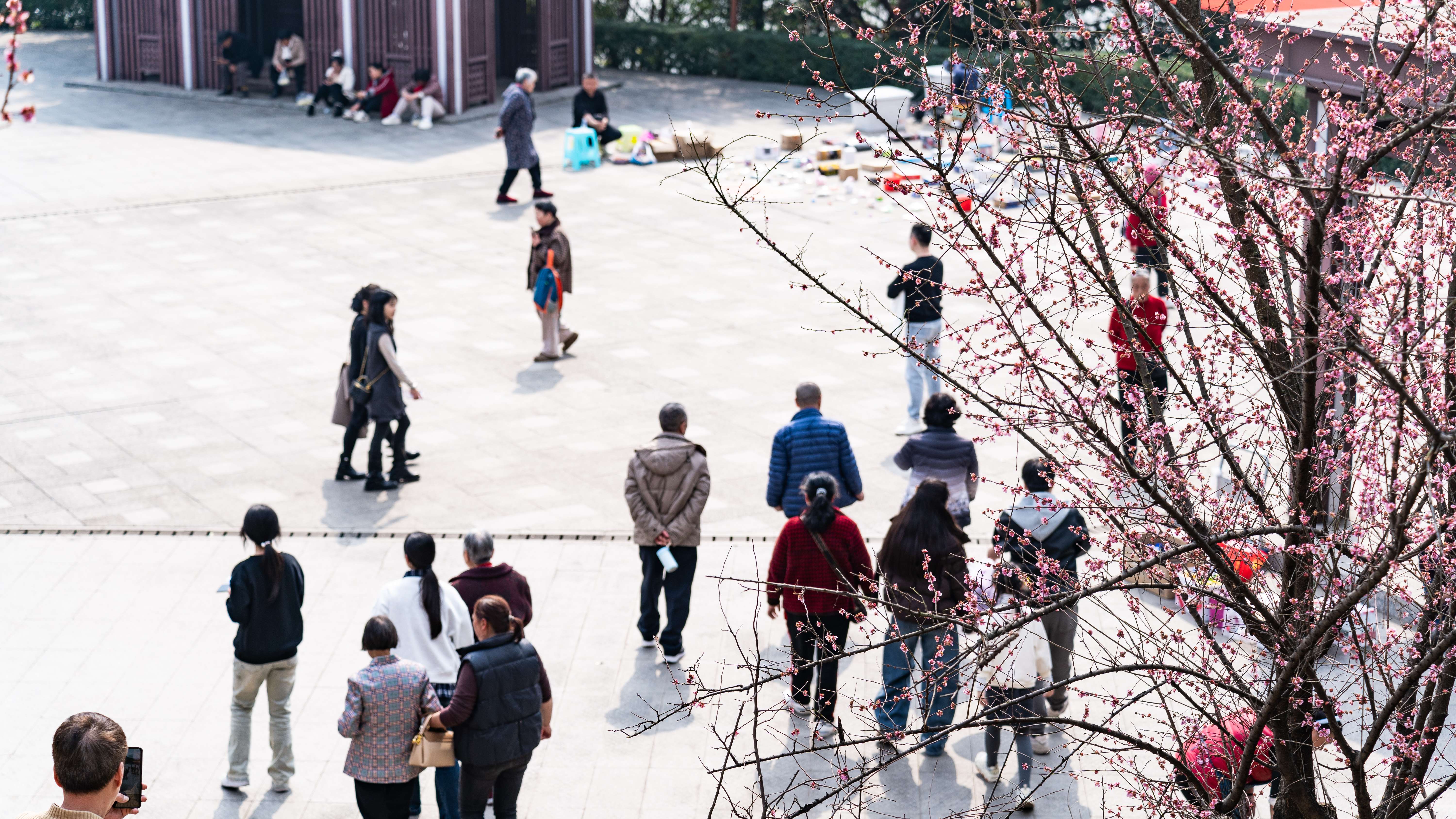 与梅花相伴的是浓浓的烟火气。流动商铺“各显神通”,售卖饮料零食的小车穿梭在人群里,糖画摊位前围满了孩子,套圈游戏周围挤满了屏气凝神的观众。经过一整个冬日的酝酿,烟火气与新春逐渐升腾,交织在江阳,饱含希望与勃发的力量。