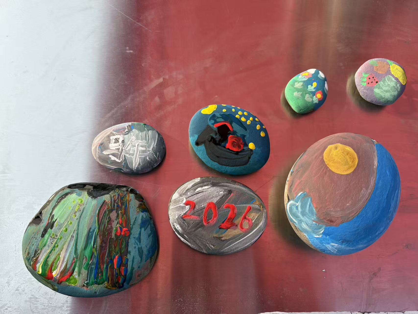 长江石手工实践课堂上,孩子们手握画笔,蘸取斑斓颜料,在一笔一画间,将石头的“坚韧”与色彩的“温柔”奇妙交融。原本沉默的长江石,经过孩子们天马行空的涂鸦,瞬间变得灵动起来,蕴藏着浓浓的新年韵味。