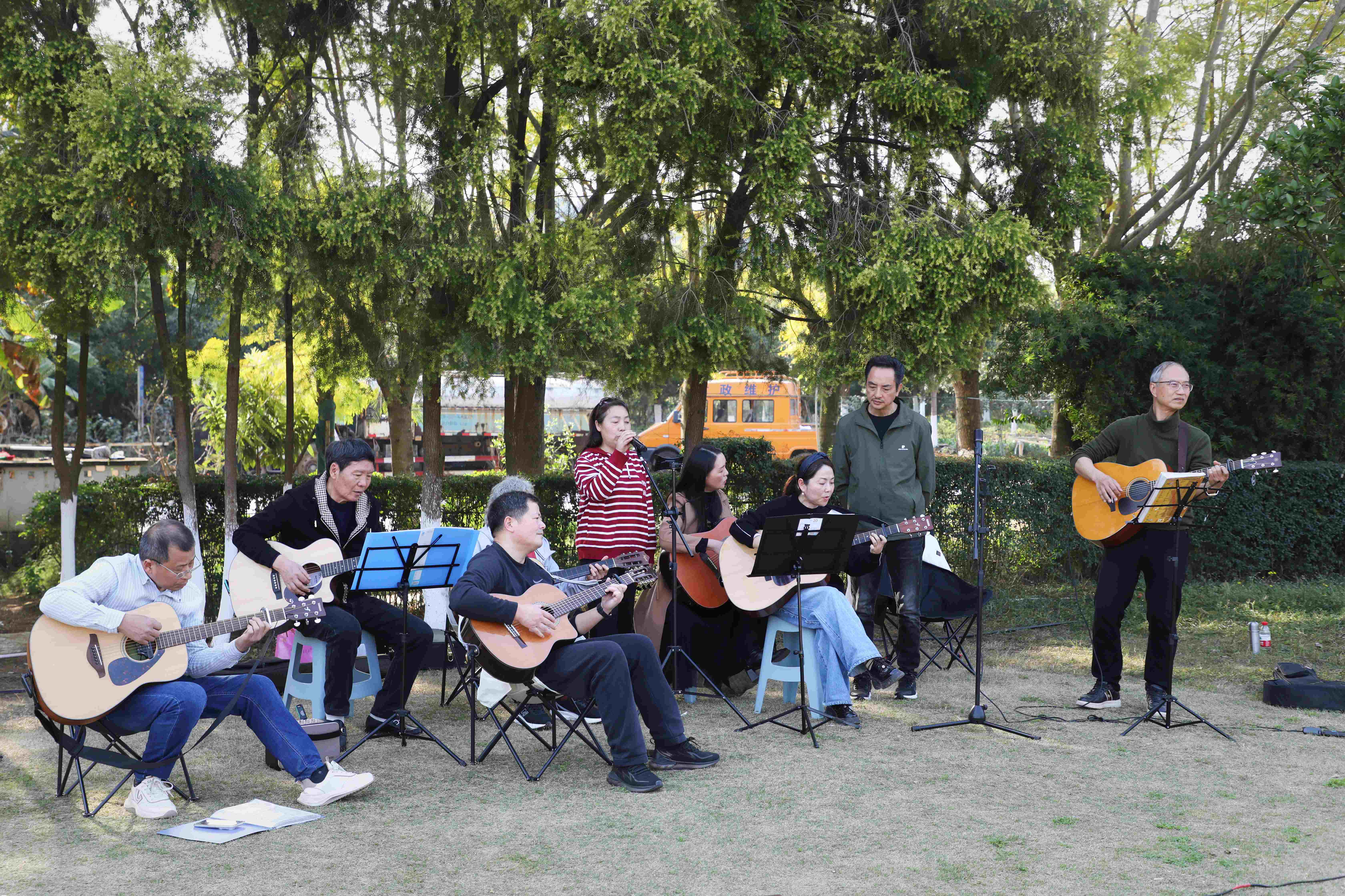 观光车穿梭于黄澄澄的花海中,孩子们在花田间追逐奔跑,风筝晃晃悠悠升上天空;游人举着手机,试图将每一帧春色都装进镜头;大爷大妈们也跟上春的步伐——吹着笛子,弹奏吉他,结成乐队,在树荫下唱起歌来。