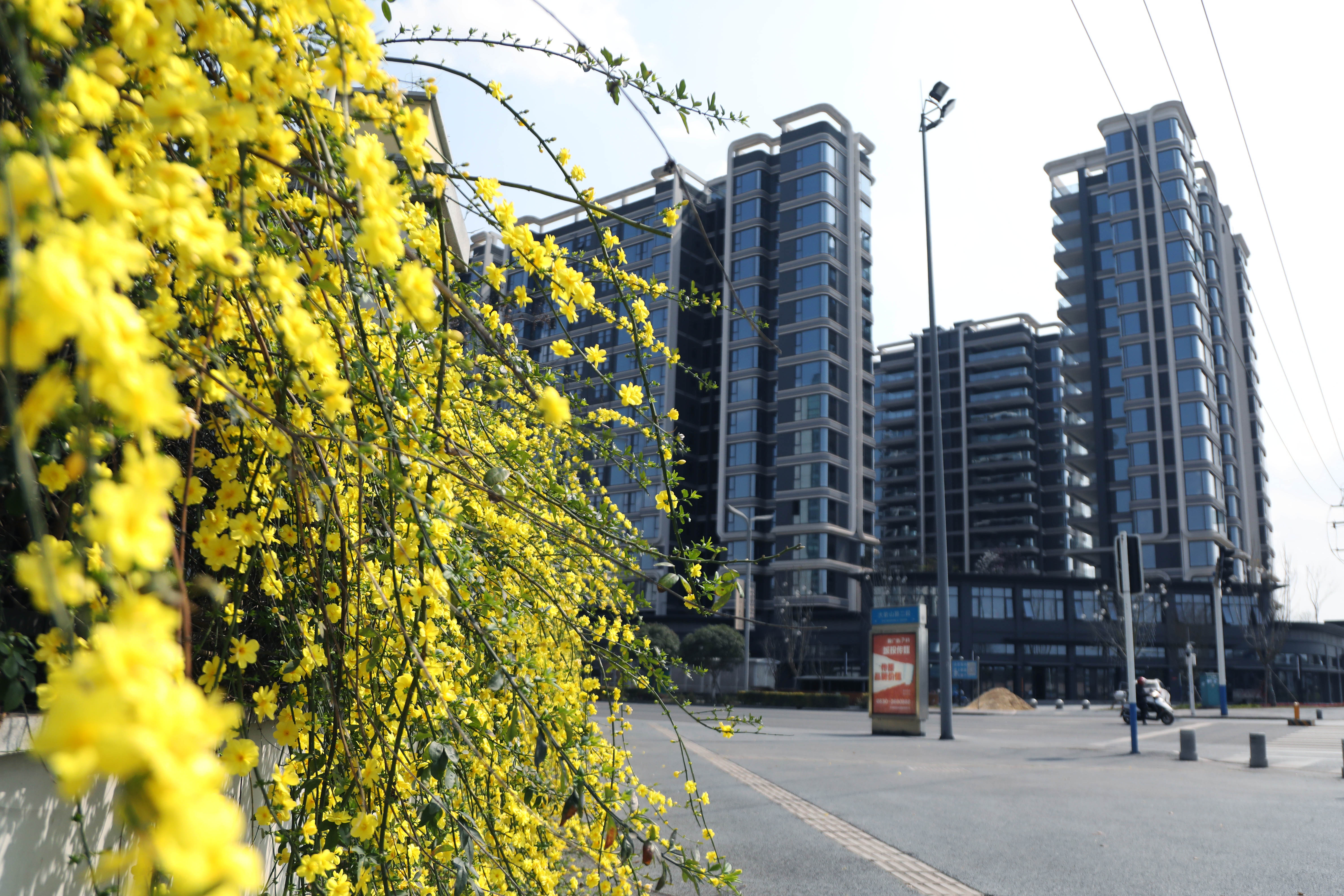 城市的角落同样被春意浸染。在城西大岩山路二段街头,浓烈绽放的迎春花成为最亮眼的街景。有的枝条倔强地向上生长,有的则像厚重的绿幕般垂落,嫩黄的花朵与花苞星星点点地缀满其间。它们在阳光下与公交站台同框,与候车市民的惬意身影相伴,构成一幅和谐美好的春日街景图,令人神清气爽。