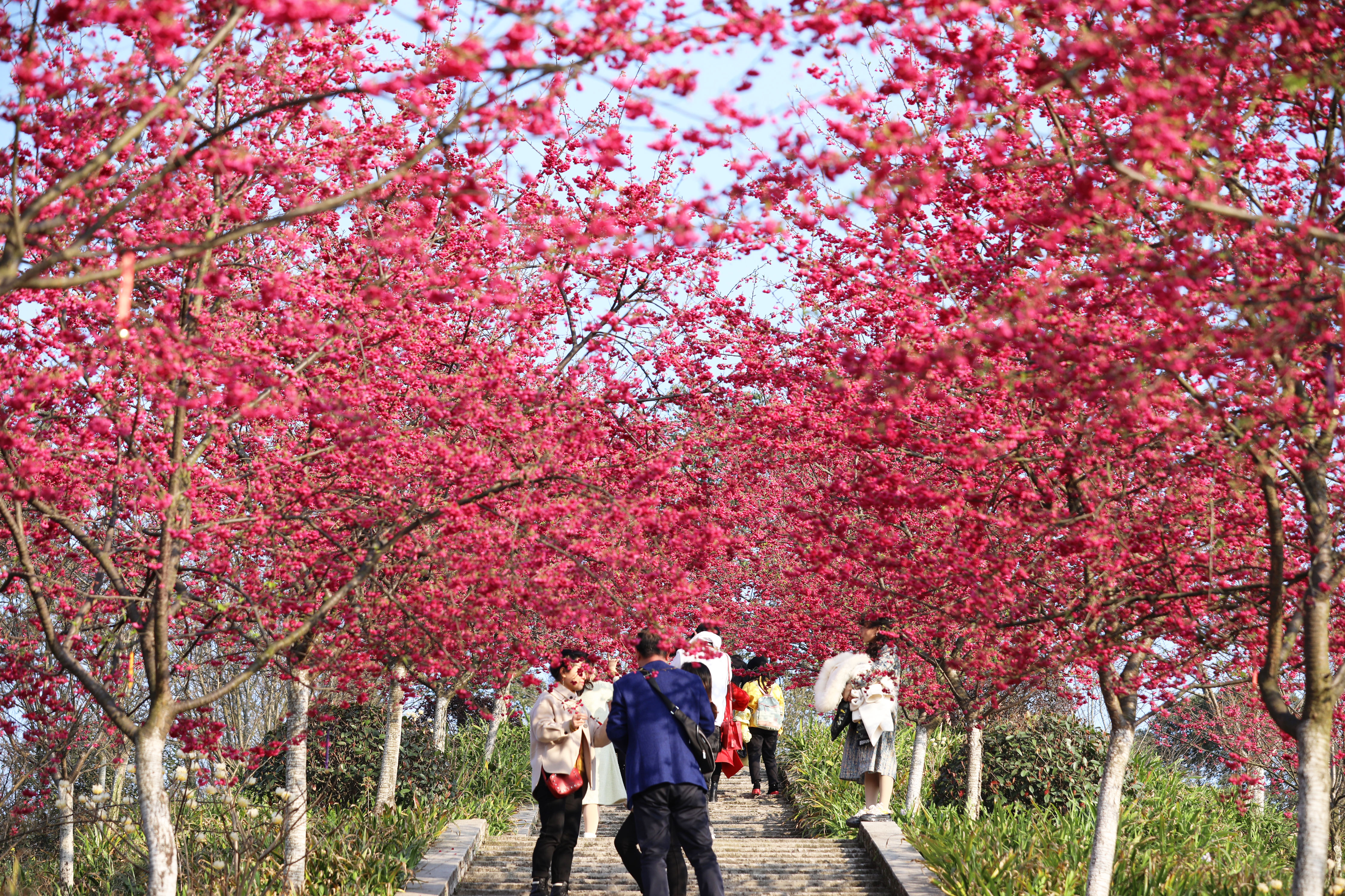 作为春日里的“老牌网红”,丹林镇樱花谷的早樱总是率先迎春。自从登上央视后,每年前来赏花的游客络绎不绝。在这片占地600多亩的山谷里,上万株樱花按花期错落开放,目前正值早樱的最佳观赏期。粉嫩的花瓣在阳光下格外治愈,微风吹过,花瓣轻拂脸颊,带来温柔的问候。不止丹林,泸州二环线、国道353线方山至江北段沿线的樱花也不甘示弱,粉色的花带沿着道路蜿蜒,宛如为城市系上了一条浪漫的丝带,行驶其间,仿佛驶入一条通往春天的梦幻隧道。