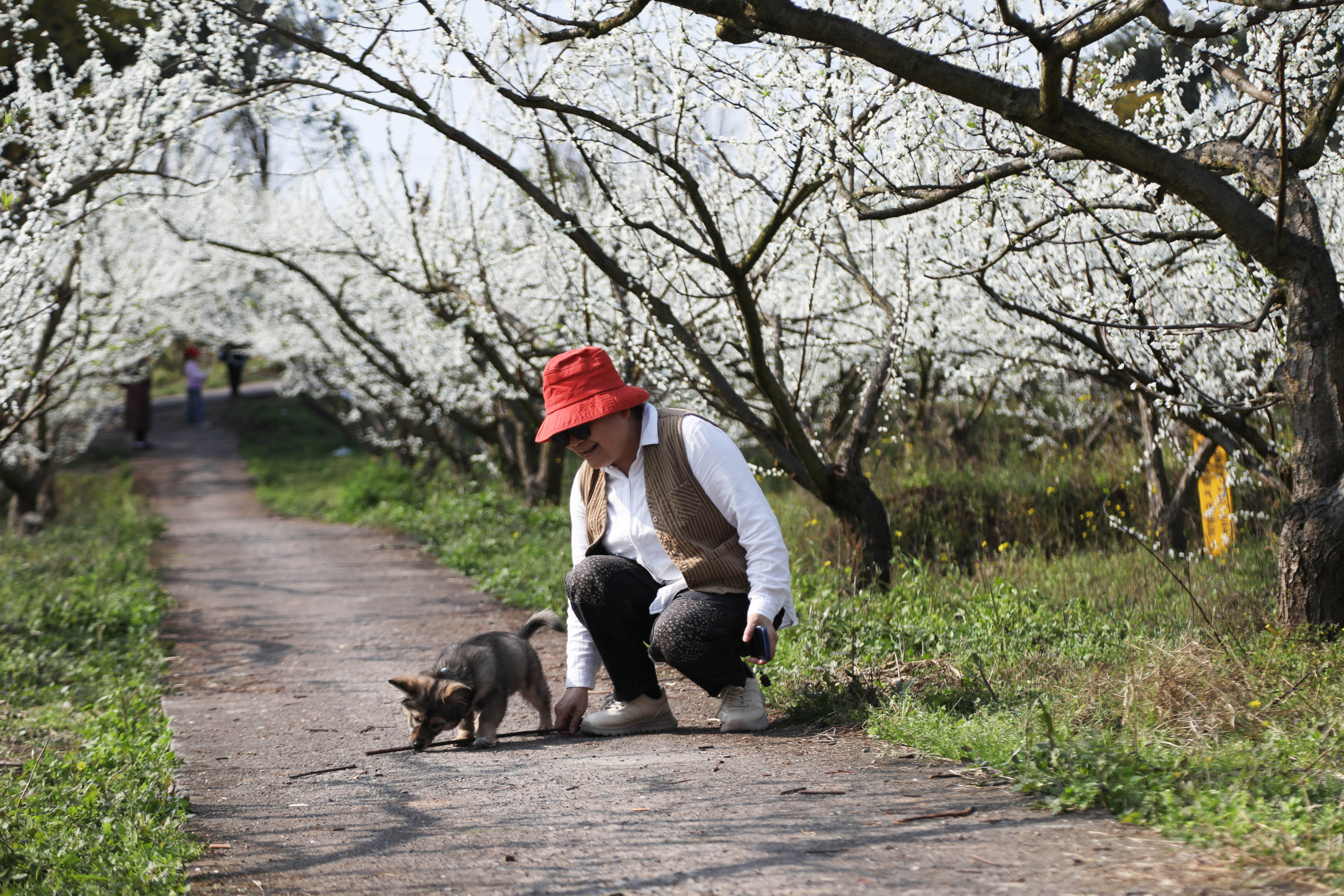 如果说樱花是热情的主角,那么江北镇福海村300亩的茵红李示范基地则是一片静谧的“白色童话世界”。一簇簇娇嫩洁白的李花缀满枝头,繁茂如雪,染白了整个山间。漫步其中,淡淡的花香沁人心脾,让人忘却尘世烦恼。“刚一下车就被这片李花震撼了,花开得漂亮,树桩也各有造型,非常美。”专程从合江驱车前来的康先生赞叹不已。同行的朋友难掩喜悦,在花丛中翩翩起舞,就连随行的小狗也尽情地在花间撒欢,享受着春日的美好时光。