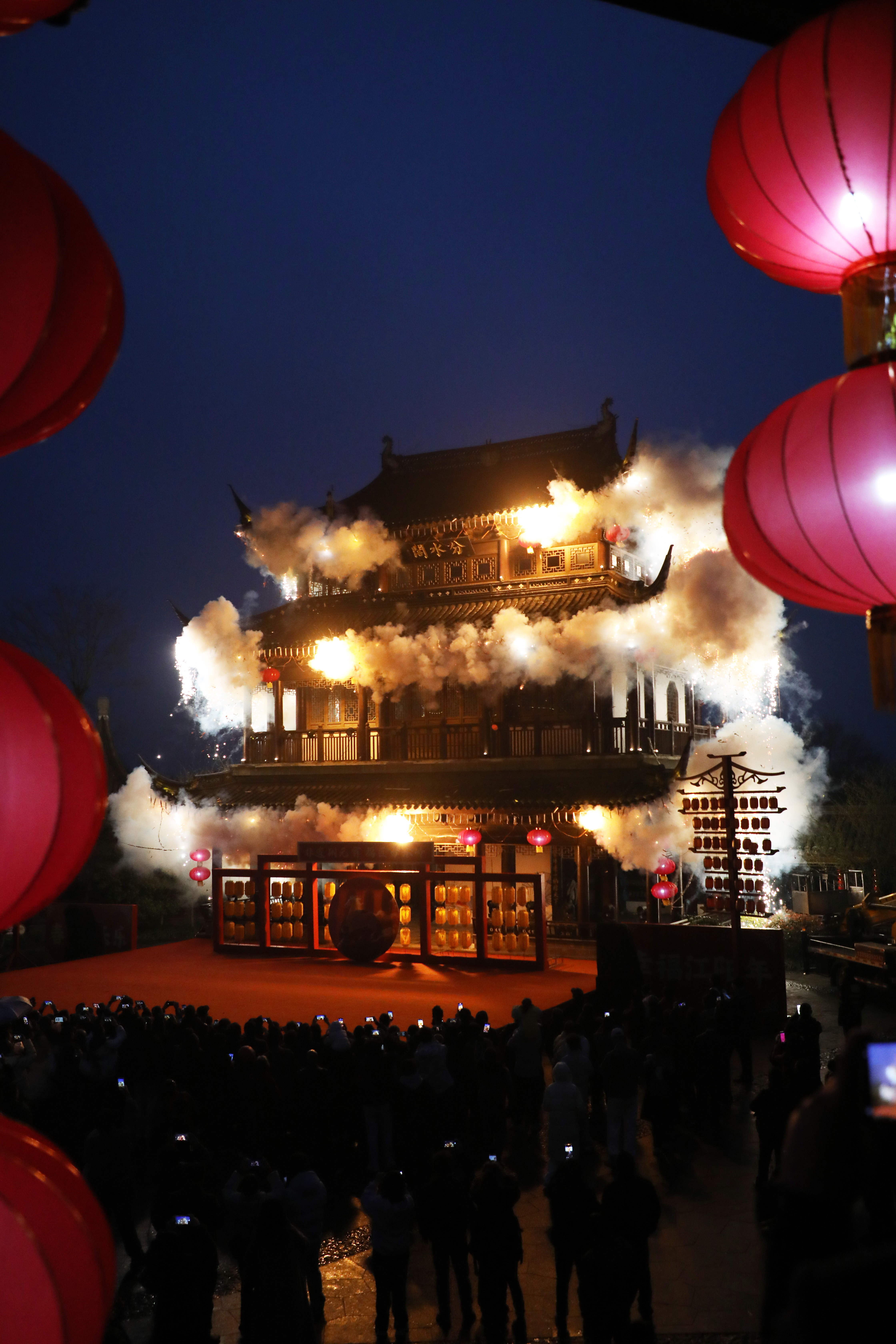 在分水阁,观众早已聚满,纷纷举起手机。一声令下,冷焰火瞬间照亮夜空,如瀑布般流光溢彩倾泻而下,将古老的阁楼映照得如梦如幻。“太美了!”惊叹声此起彼伏。
