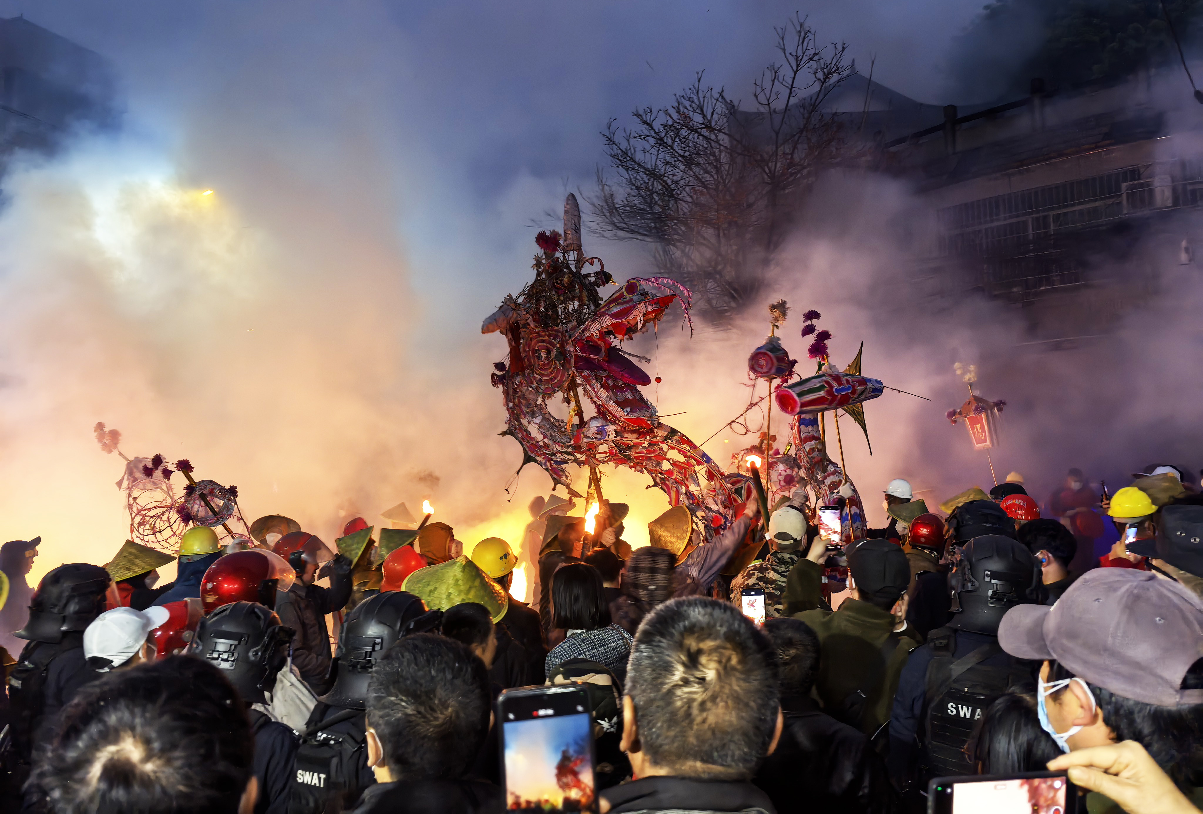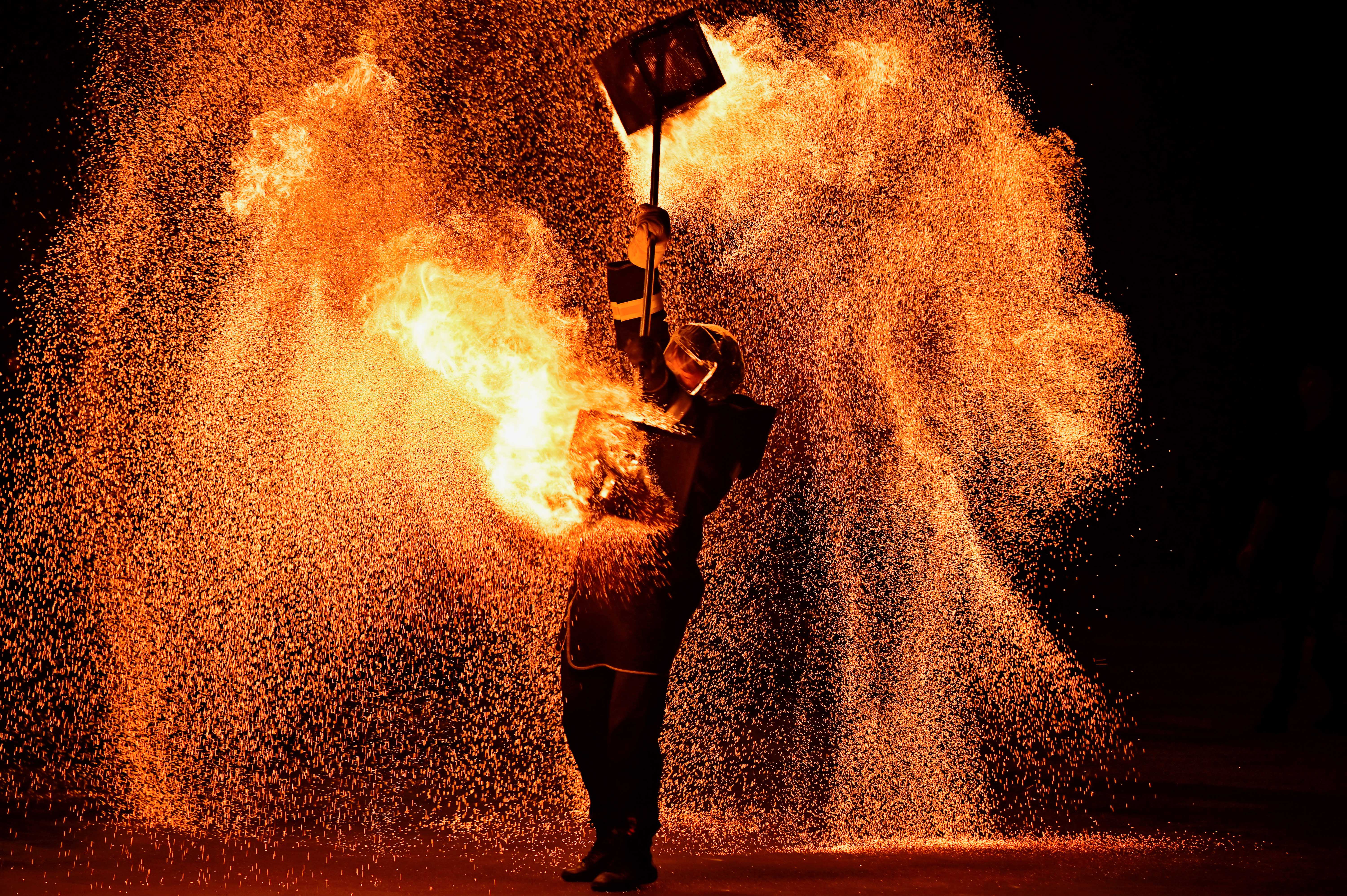 令人屏息的是火壶表演。表演者上下跃动,抬手抖腕间,火壶激起无数火星,火气升腾、光华四溢。刀棍挥舞,熊熊烈火萦绕成龙,带动起烈焰纷飞,观众连连叫好。