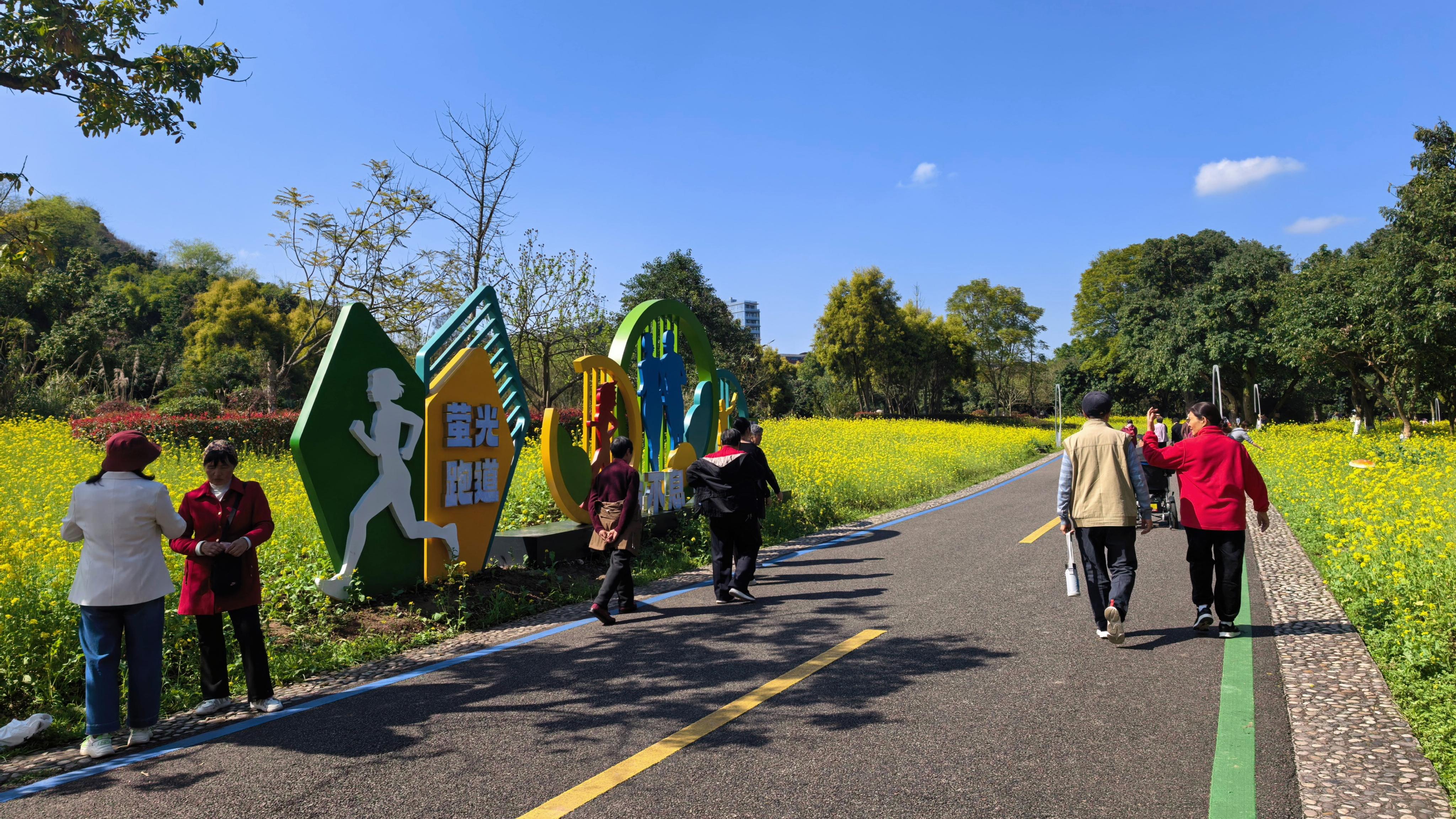 正值初春,赛道两侧的油菜花开得正好,清风拂过,掀起层层金色的波浪。奔跑其间,脚下是柔软的跑道,眼前是摇曳的花海。江风裹着淡淡的花香扑面而来,晨雾中,滨江路的绿意与微光交织,每一步都仿佛踏在春天的诗行里。