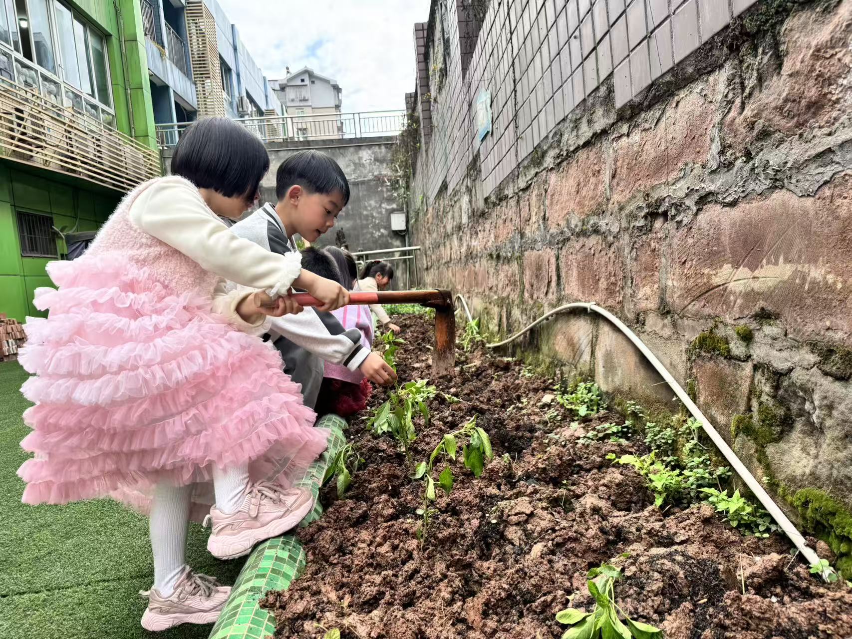 有的孩子专注地扶稳菜苗,生怕它歪倒;有的孩子用小锄头轻轻拍打泥土,让菜苗扎根更稳;还有的孩子蹲在一旁,仔细观察着刚种下的幼苗,眼里满是期待与欣喜。孩子们相互协作、彼此帮忙,原本空旷的种植园里,很快就栽满了嫩绿的菜苗,也留下了一串串充满童趣的脚印。