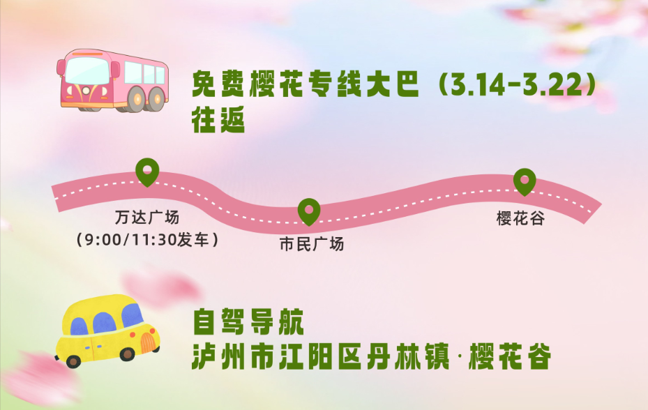 为方便市民出行,活动期间开通免费樱花往返专线,每日9:00、11:00从万达广场发车,途经市民广场直达樱花谷。