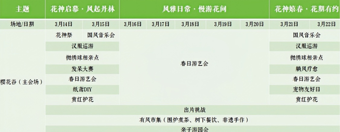本届花朝节以“花朝风信 春动丹林”为主题,持续至3月22日。开幕式当天,花神祭典将唯美上演;活动期间,国风音乐会、汉服巡游、抛绣球、发呆大赛、纸鸢DIY、春日游艺会等精彩活动轮番登场。购票即送游园地图、免费拍照、祈福丝带等众多福利。