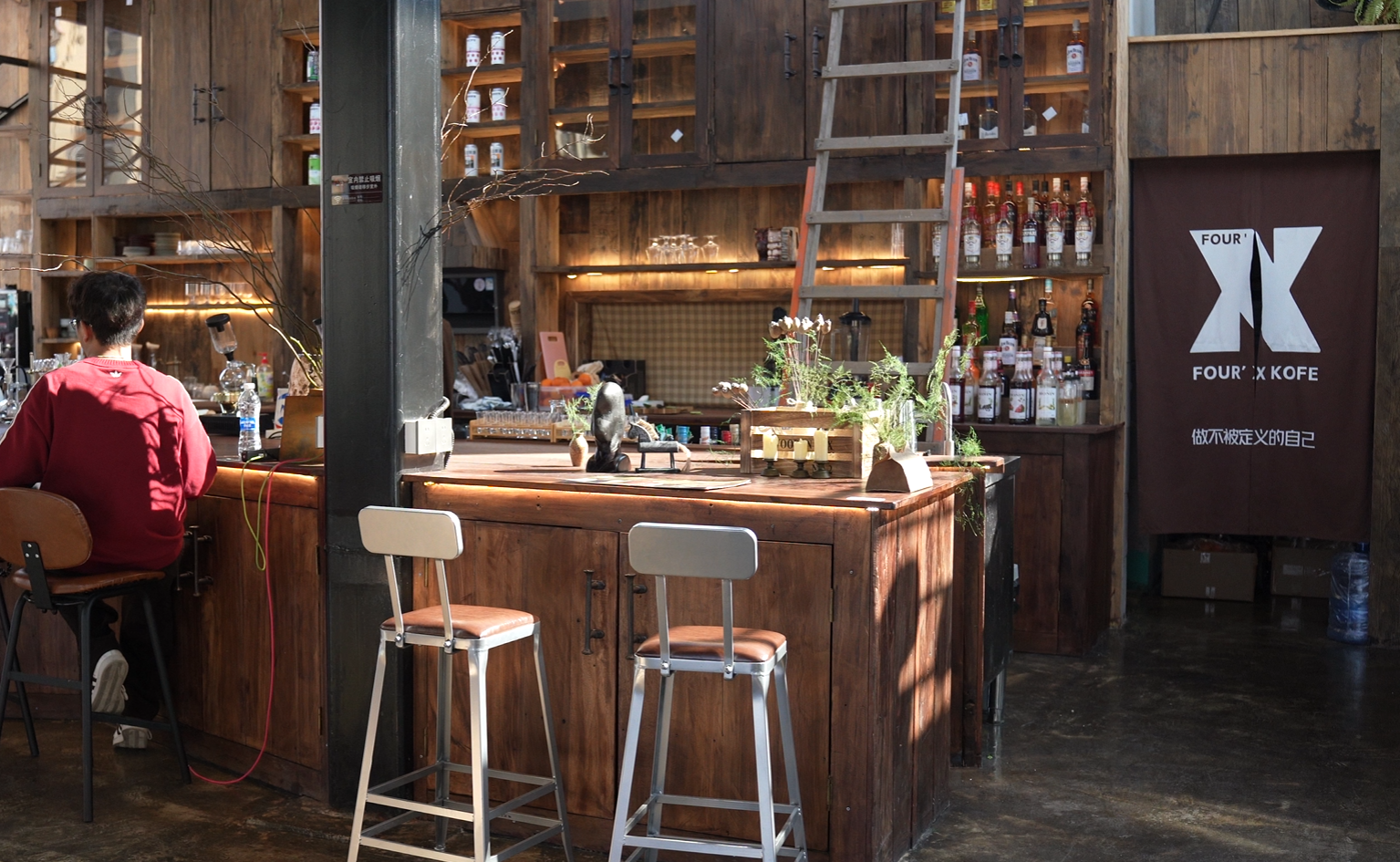 如果说莫奈花园是闺蜜的轻松时光,那不远处的FOUR’X KOFE便是年轻人的闲适聚集地。工业风的咖啡馆简单而不简约,咖啡与炸物的香味交织氤氲,阳光洒落在货架的玻璃瓶上,折射出缤纷色彩。店内年轻人自由闲适,或是情侣聊天约会,或是兄弟聚会畅谈,亦或带着笔记本与耳机,在咖啡的香味中忙碌着自己的事。在咖啡馆里,包容与自由成为了这里的底色。