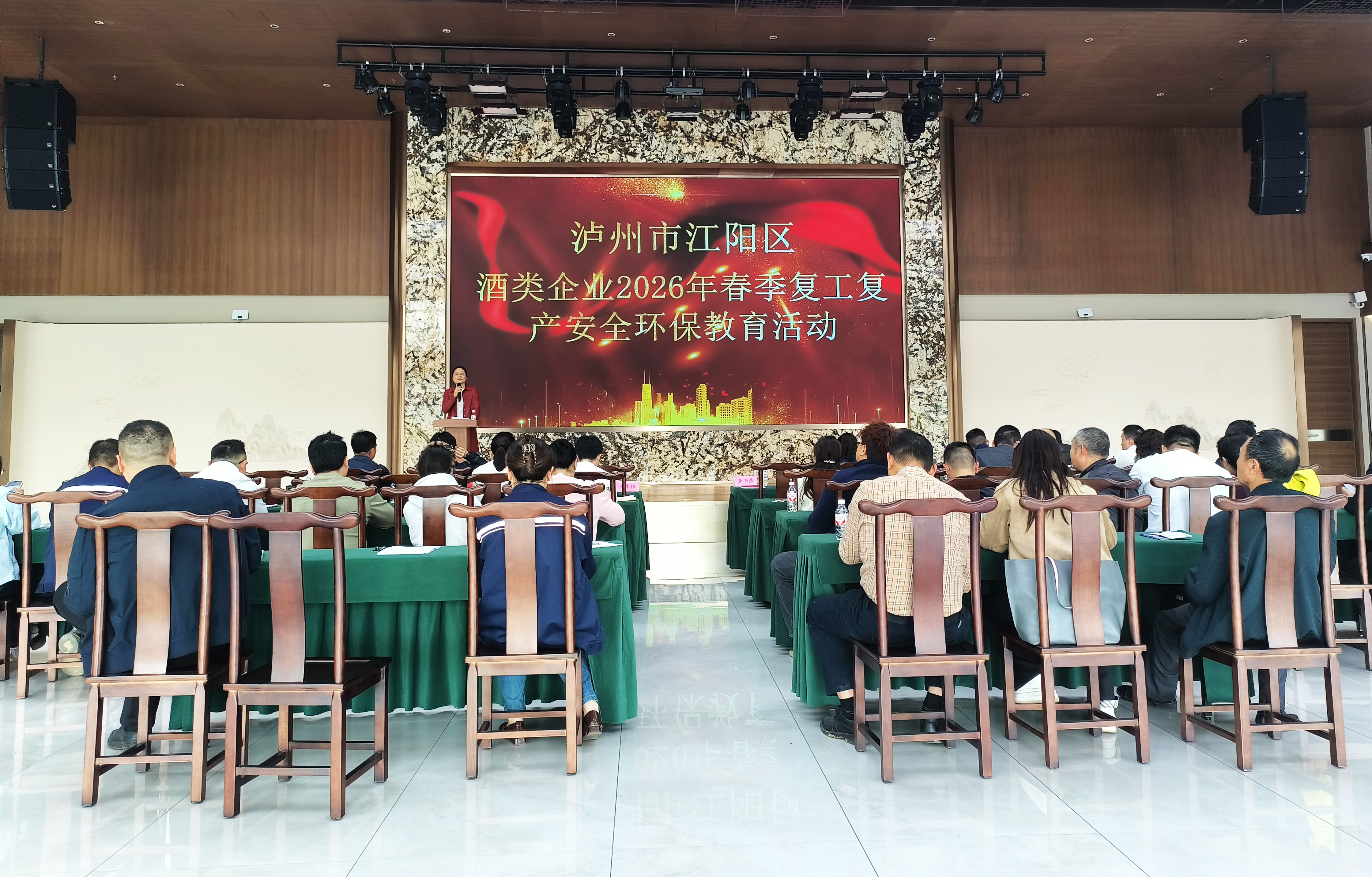 江潮讯(记者 张红)当前正值酒类企业全面复工复产的关键时期,针对人员返岗集中、设备启动频繁、风险隐患叠加的阶段性特点,3月12日,江阳区组织开展酒类企业2026年春季复工复产安全环保教育活动,旨在进一步压实酒类企业主体责任,有效防范化解安全环保风险,确保全区白酒产业平稳有序复工、安全高效生产。全区酒类生产企业负责人、安全管理人员及环保管理人员等50余人参加活动。