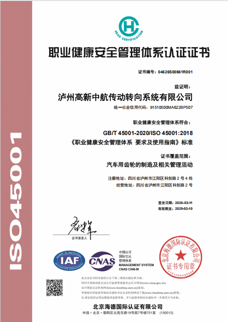 江潮讯(记者 张红)近日,位于江阳区的泸州高新中航传动转向系统有限公司传来喜讯,该公司成功获得ISO 45001职业健康安全管理体系认证与ISO 14001环境管理体系两项权威认证,标志着企业在安全管控与环境治理的标准化、规范化建设上迈入了全新阶段。