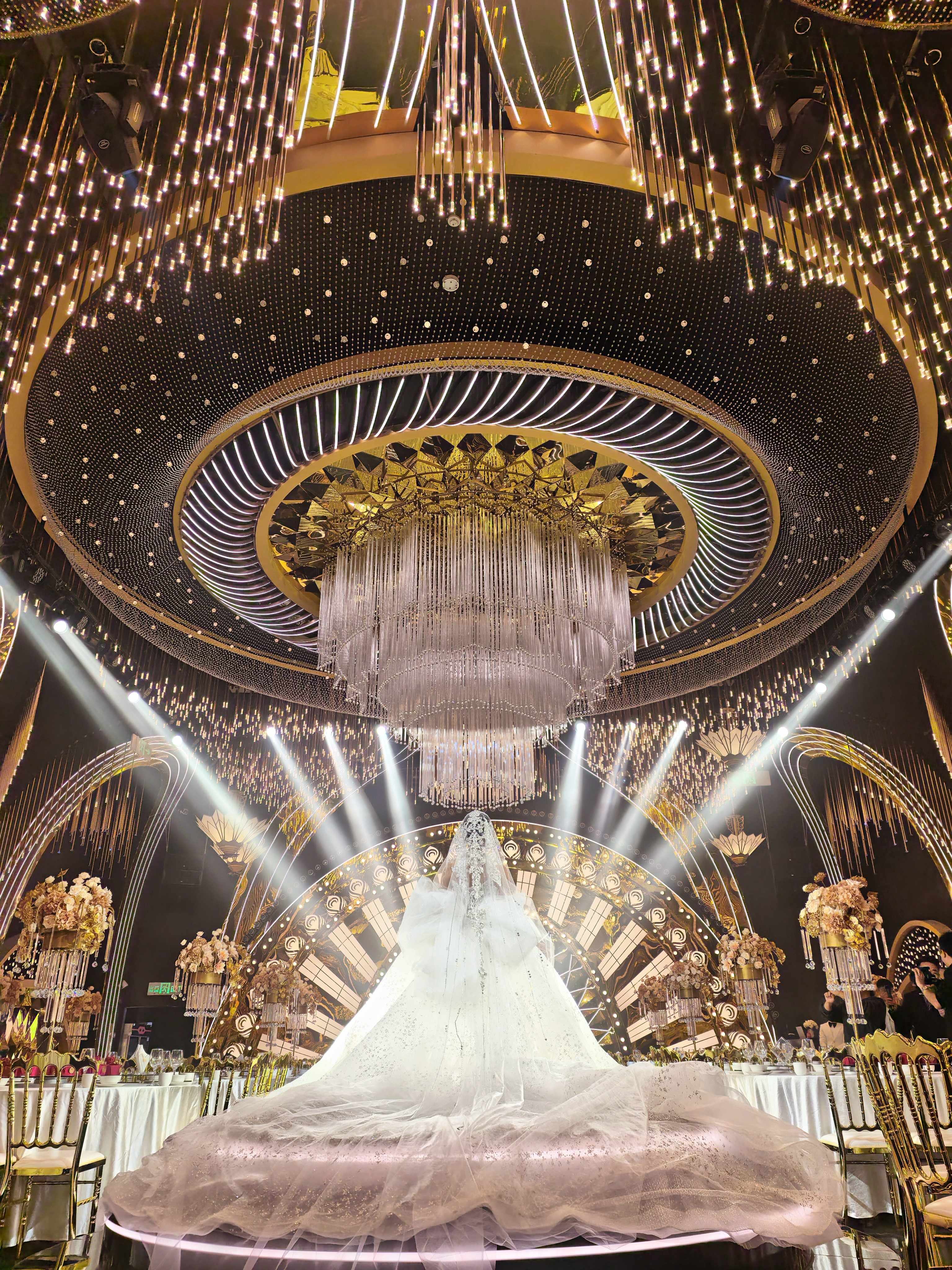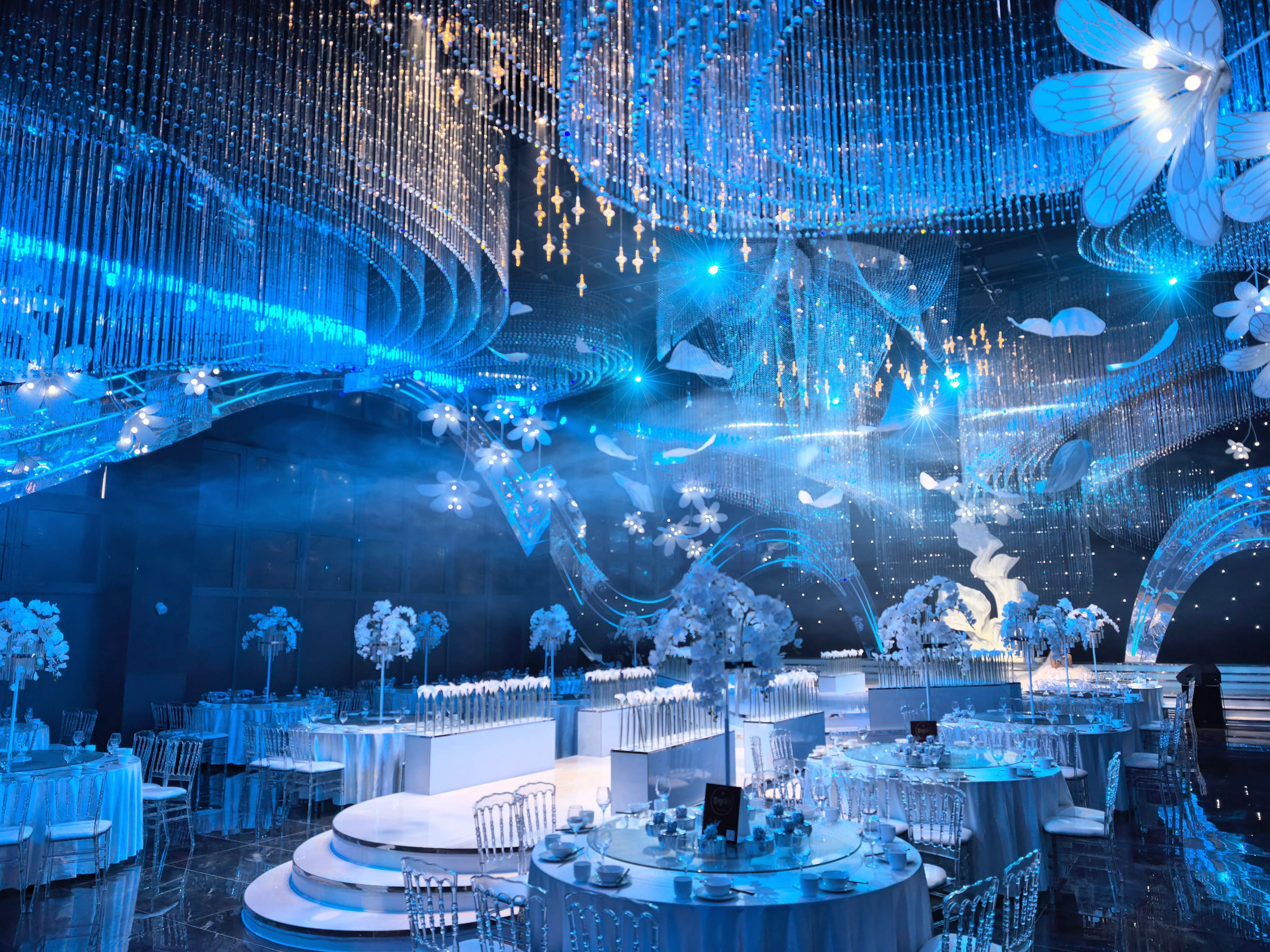场内四大主题场景各具特色。奥斯卡厅主打个性潮流,潮流灯光秀与时尚婚纱秀轮番上演,互动打卡环节让年轻人跃跃欲试。浮光琉璃厅营造浪漫唯美氛围,氛围感仪式展示与模特礼服相得益彰。环水礼堂以“爱的生命力”为主题。开场舞蹈灵动飘逸,新人入场、问誓环节庄重深情,最令人动容的是放飞蝴蝶仪式——数百只彩蝶翩然飞出,象征爱情破茧成蝶。