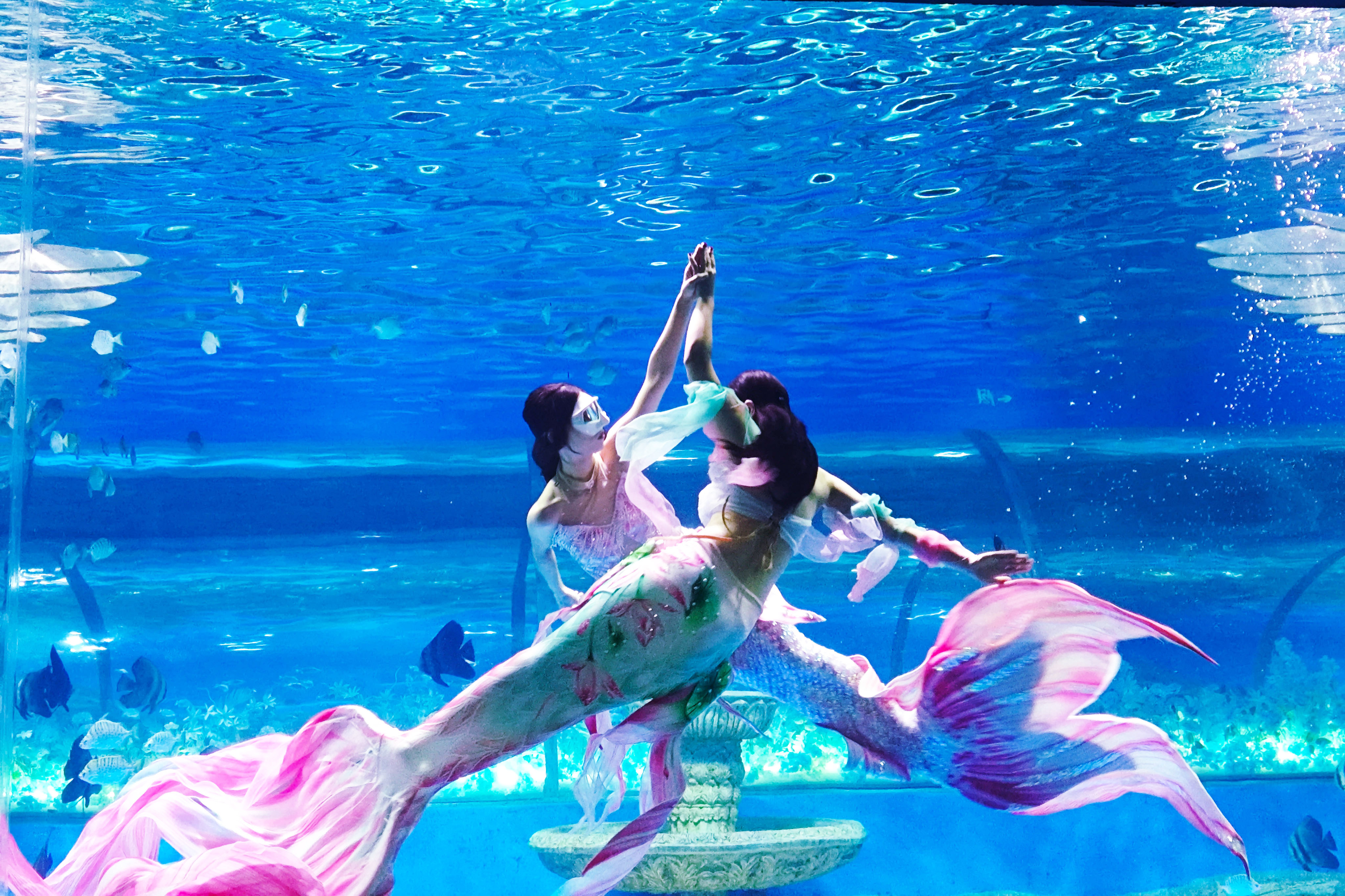 美人鱼表演中,湛蓝的水里,美人鱼身姿轻盈,与鱼群共舞,翻转、比心、吐泡泡,宛如童话故事里的公主跃入现实,每一次亮相都引来阵阵惊叹。