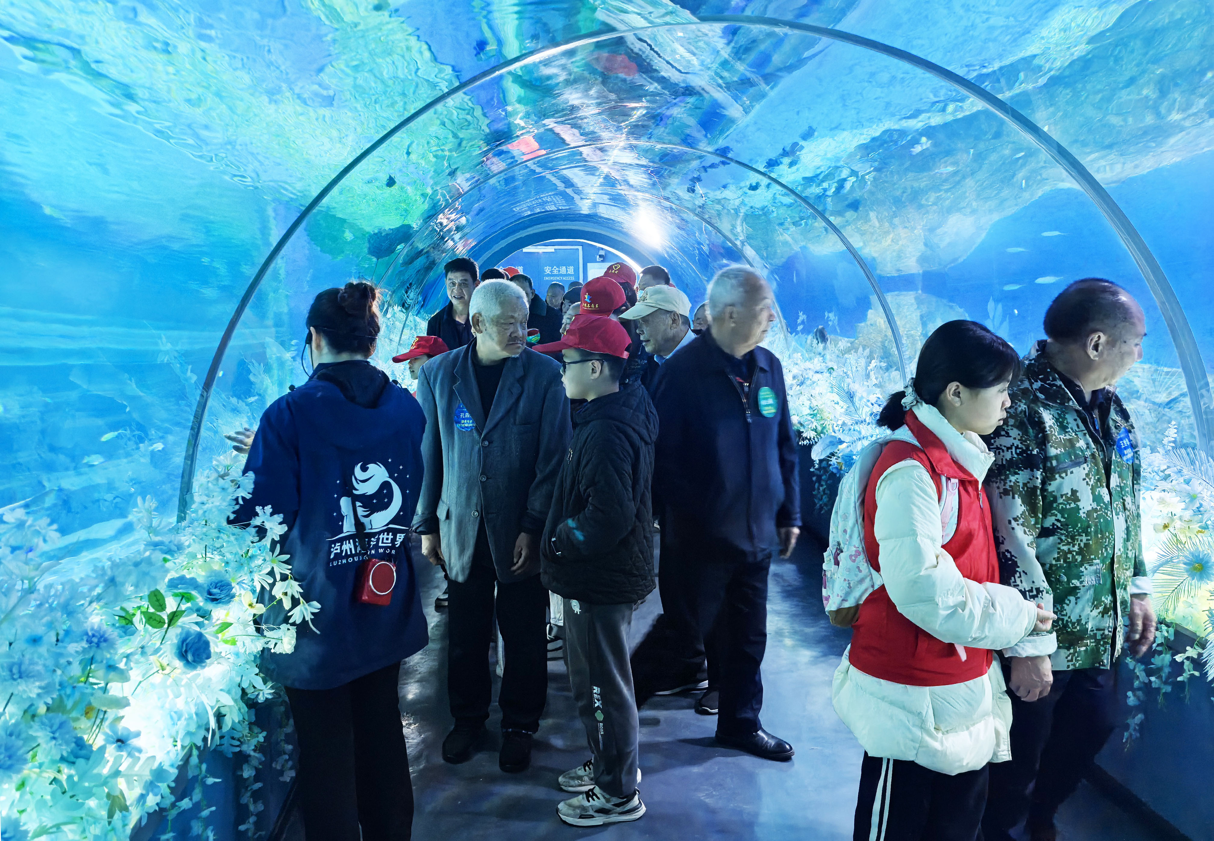 走进海底隧道,弧形玻璃穹顶之上,成群的鱼儿悠然游过,光线穿过水波,在脸上洒下流动的光影。抬头是鱼群如飞鸟般掠过,耳边是水声低语,整个人都被温柔包裹。