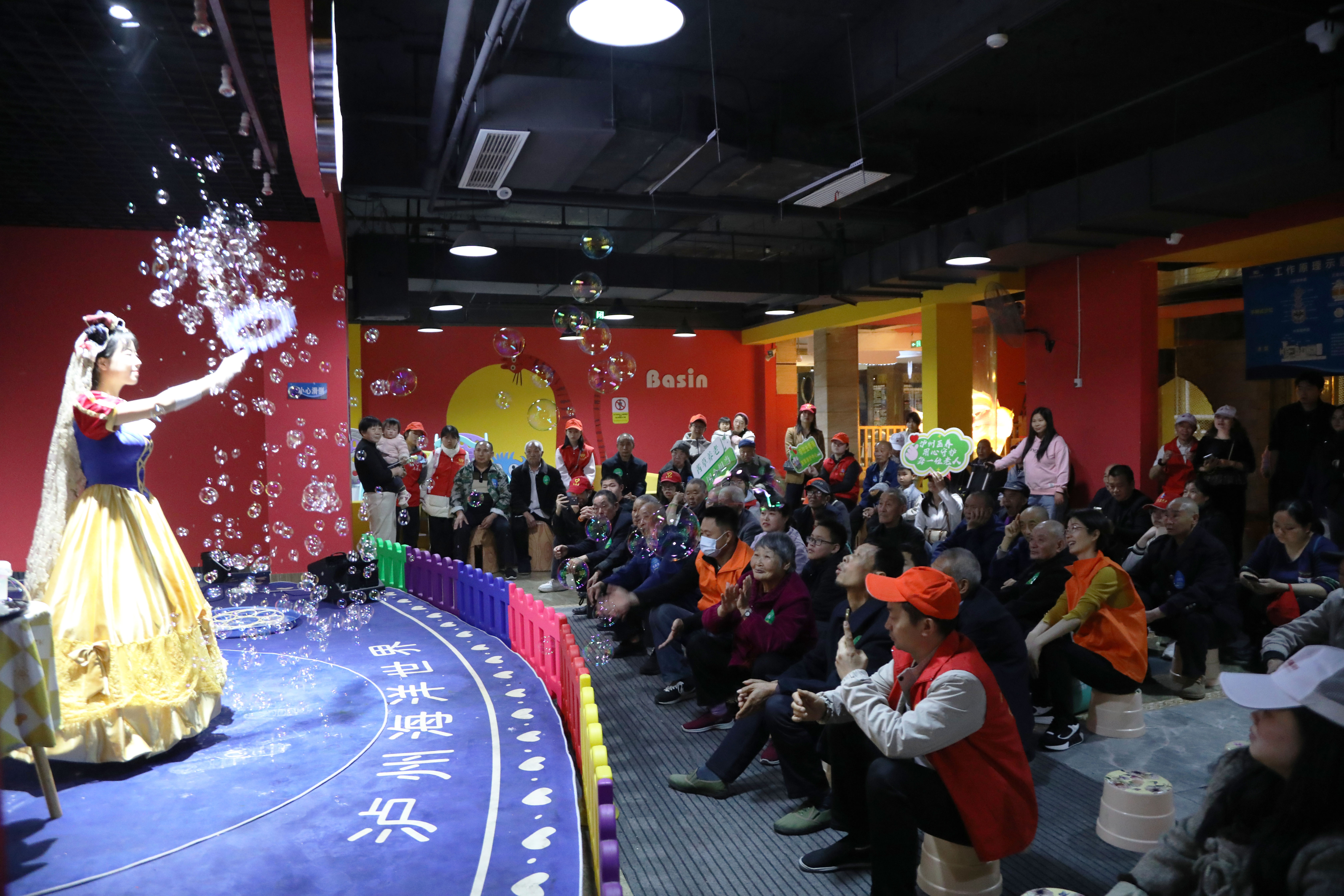 泡泡秀表演,漫天的泡泡在灯光下折射出七彩光芒,时而如雪花飘落,时而如云朵般巨大。孩子们追逐着泡泡奔跑嬉闹,大人也忍不住伸手触碰,童心瞬间被唤醒。