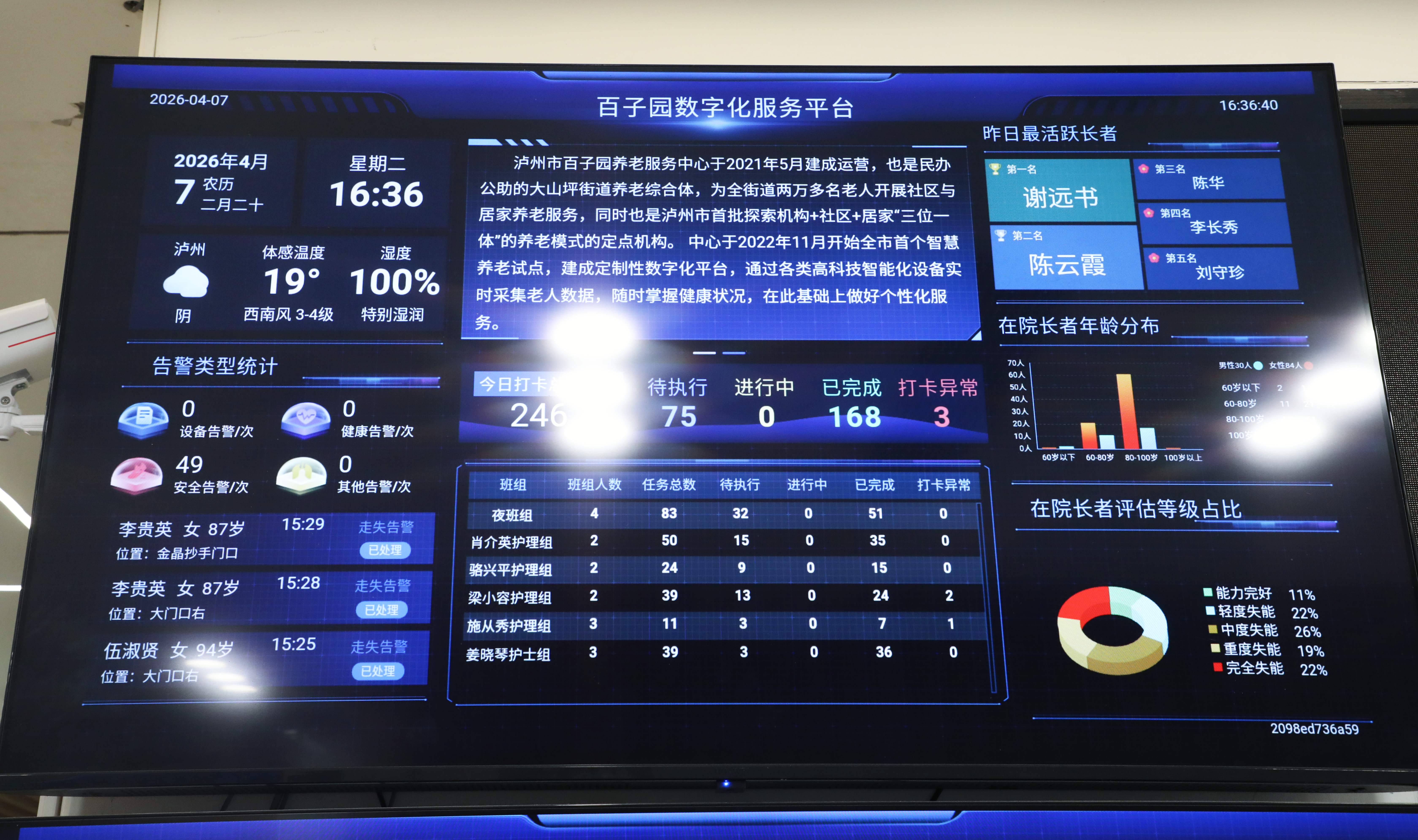 系统还清晰呈现轻度失能、重度失能以及男女老人比例,实现服务数据化、精准化。