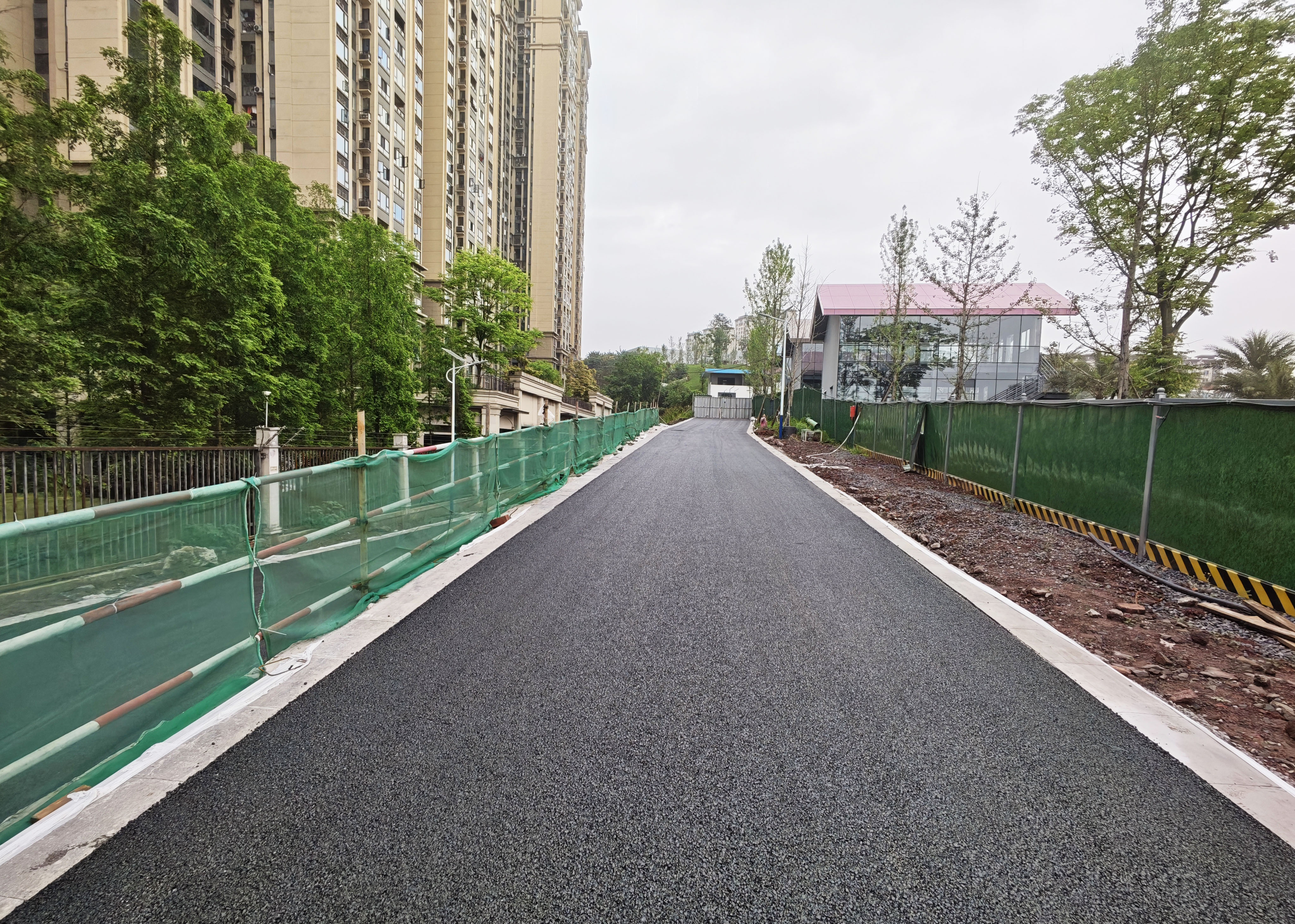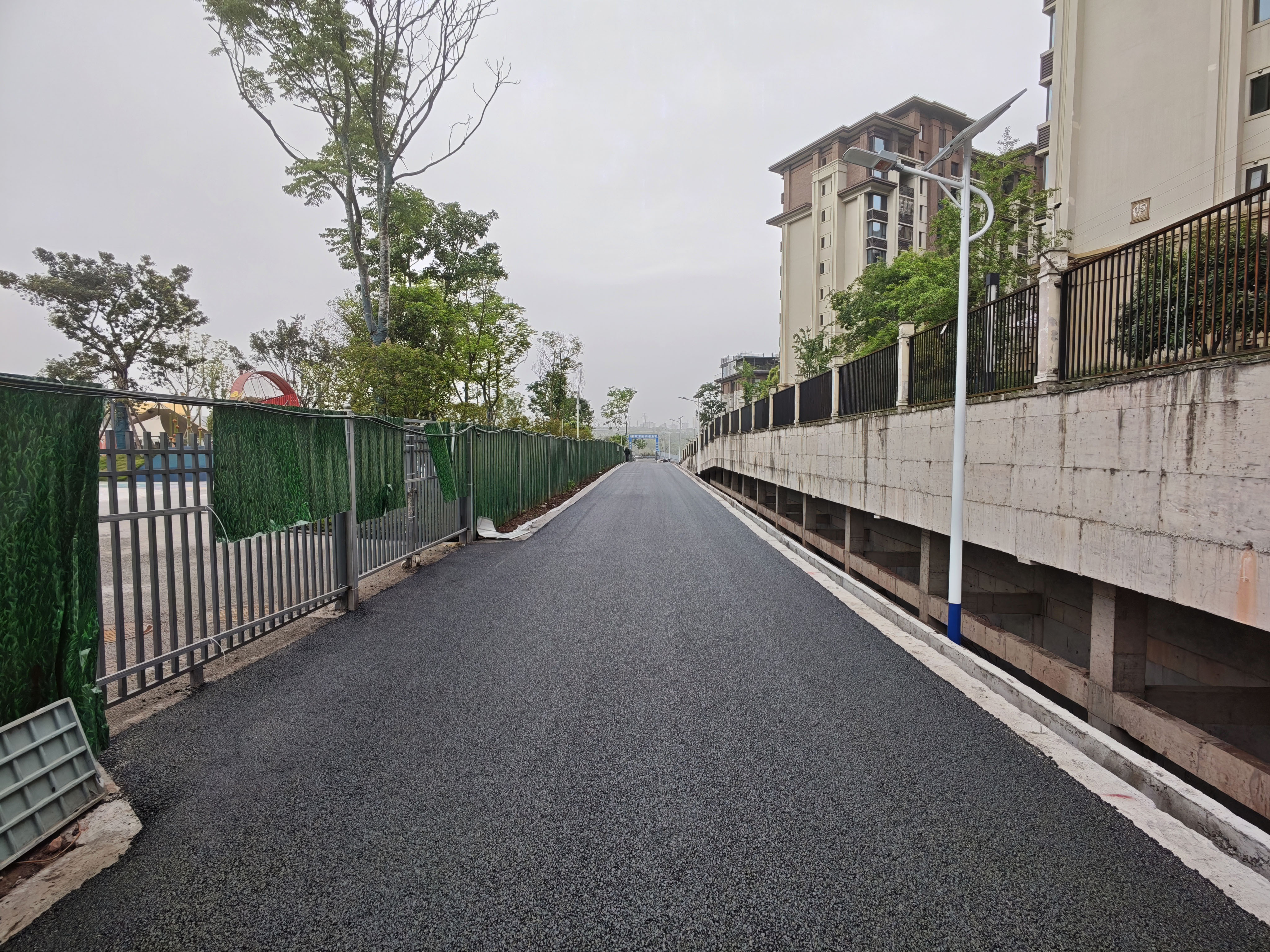 该通道整体呈“Y”型布局,其中一条道路宽4.5米、全长273.55米,途经和丰运动公园东侧接入小区内部;另一条道路宽4.5米、全长119.868米,主要用于疏通原和丰运动公园内部的消防通道。两条道路共同构成周边居民出行与应急保障的“微循环”。