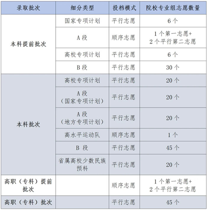 本科批次A段含国家专项计划、地方专项计划,均实行平行志愿,分别设置20个院校专业组志愿。