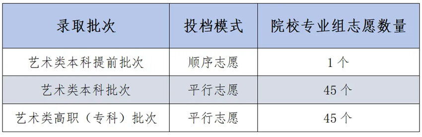艺术类高职(专科)批次实行平行志愿,设置45个院校专业组志愿。