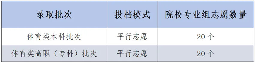 体育类高职(专科)批次实行平行志愿,设置20个院校专业组志愿。