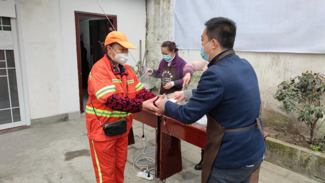 九点左右,环卫工人结束了清晨的第一轮工作,东门口社区的志愿者们将一碗碗热腾腾的汤圆就送到了环卫工人的手上,同时社区还为他们准备了小纪念品,感谢他们对城市建设的辛勤付出。东门口社区书记陈文江说:“环卫工人们工作辛苦,在元宵佳节社区希望能尽微薄之力,让她们感受到社会的关心和温暖。”