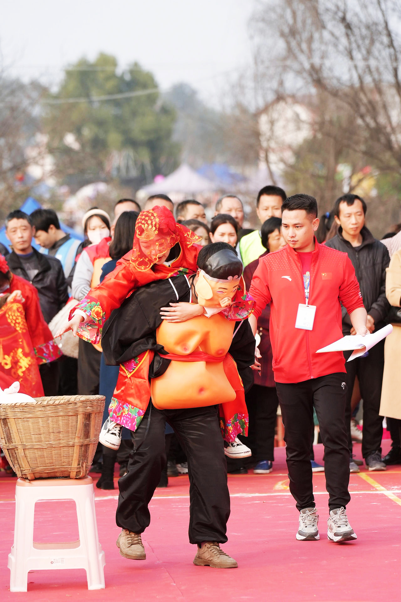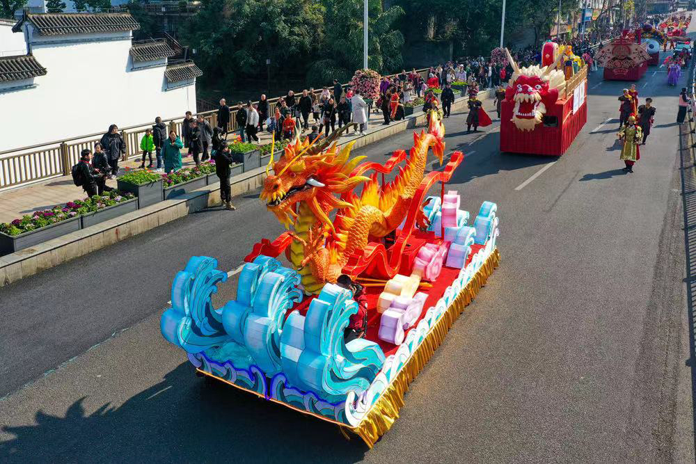 14:30,花车巡游和民俗文体活动开始。花车巡游从高速路口“大海椒”出发,途经竹兴路十字路口、石堰沟到达伞里,将在岭南锦城岔路口、场镇十字路口、董允雕像定点表演,四辆特色民俗花车靓花双眼。民俗文体活动将在蔬式广场举行15个街镇代表队参加的接福挑战赛、旱地龙舟赛、拔河比赛、猪八戒背媳妇总决赛,拉拉队员再多都不嫌多。