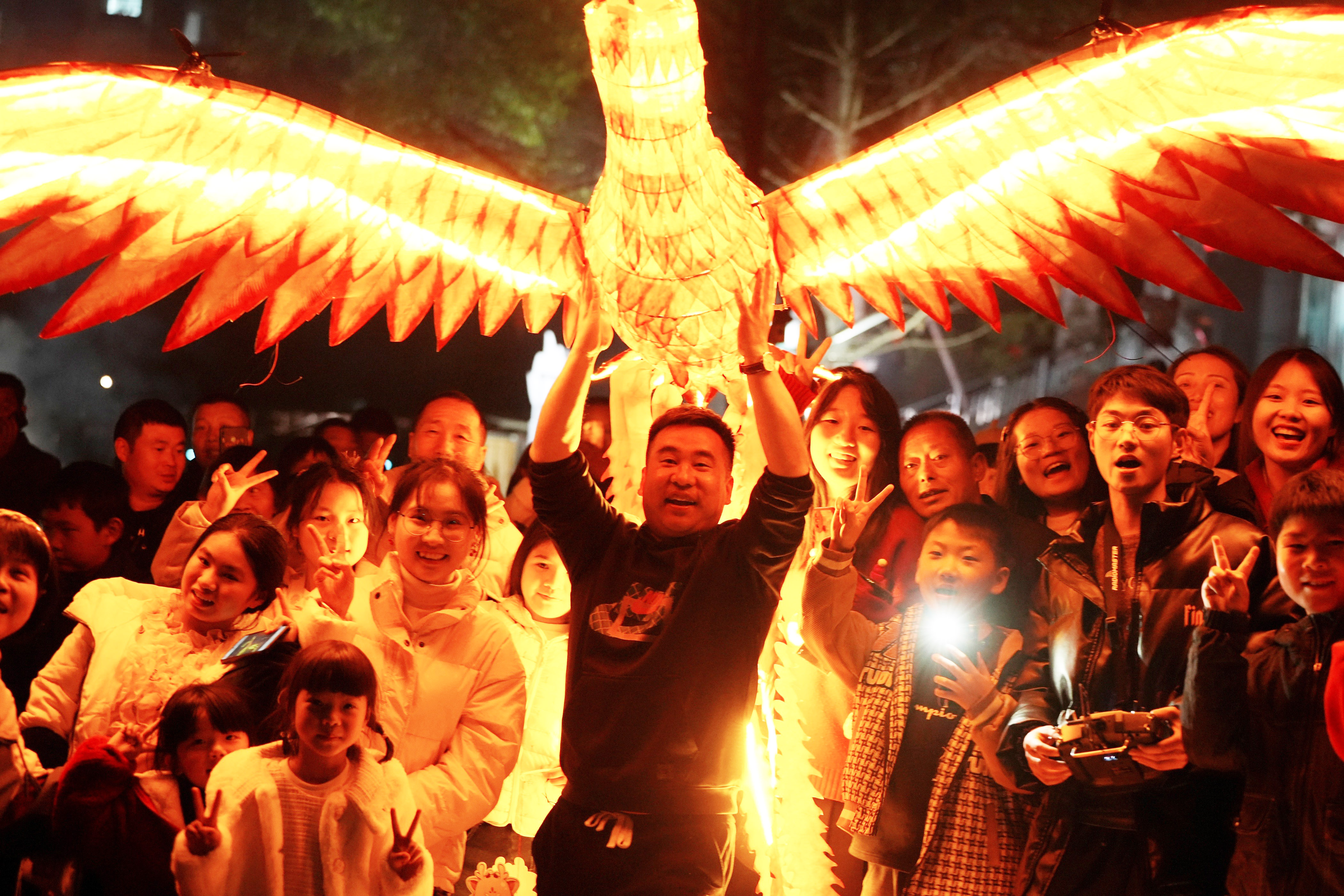 吸睛!吸睛!“非遗闹元宵 龙游分水岭”活动还有一道新菜——“龙凤飞天”,一对全身金光的凤凰和飞龙翱翔夜空,届时大家将会看到“火龙绕场、龙凤齐飞”的景象。