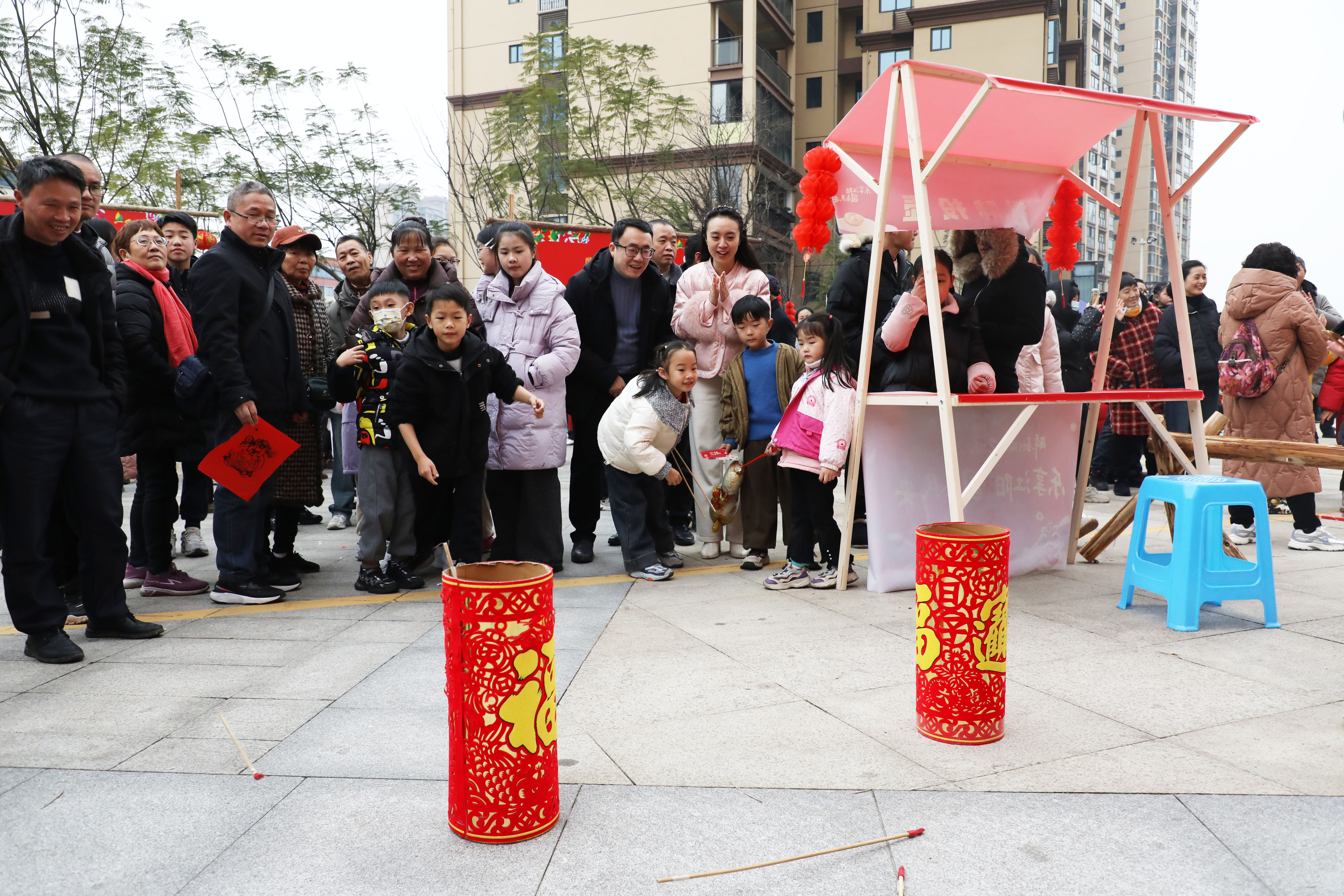 群众民俗活动现场,高车踢碗、女子晃圈、女子蹬伞、蹬坛子桌子、巧顶花坛、花式篮球、舞中幡、吐火、川剧变脸等民间杂耍赢得观众阵阵掌声。新春游园会的花式好运红包墙、滚铁环、传统剪纸、水版年画、推独轮车、投壶、手锯木板、大锤砸钉等十几个互动项目吸引众多群众参与。舞龙舞狮精神百倍,歌王争霸亮一嗓子,击鼓祈福虔诚顺意,群众在欢声笑语中感受着新春的喜悦和活动带来的乐趣。