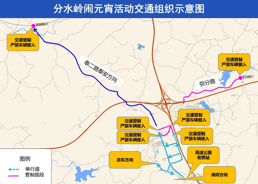 四、交通组织分水岭镇实施单向通行,活动当天需要离开分水岭镇的车辆可经泰二路离开,解除单向通行时间按照实际情况执行。(图三:分水岭闹元宵活动交通组织示意图)