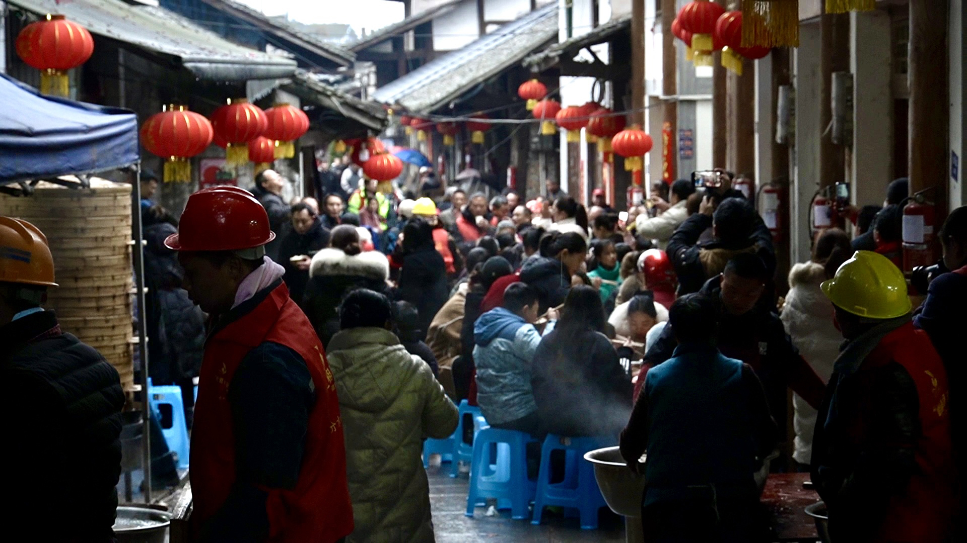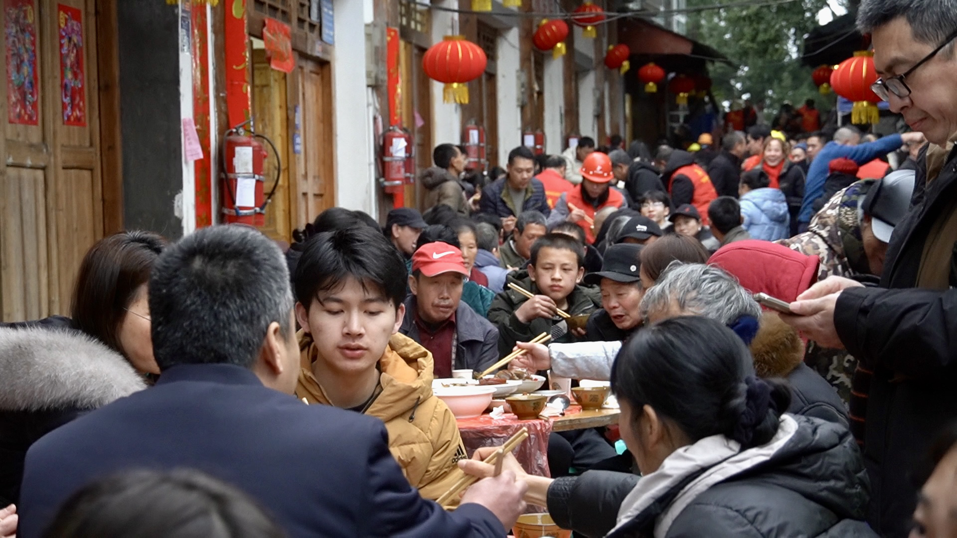 宴席之上,最具地方特色的菜肴琳琅满目,热气腾腾的扣肉、寓意“步步高升”的糍粑、鲜美可口的炖土鸡……每一道菜都承载着家乡的味道和对新年的美好祝愿。老人们畅谈往昔,年轻人推杯换盏,吃得满脸欢喜,整个长街洋溢着幸福气息。