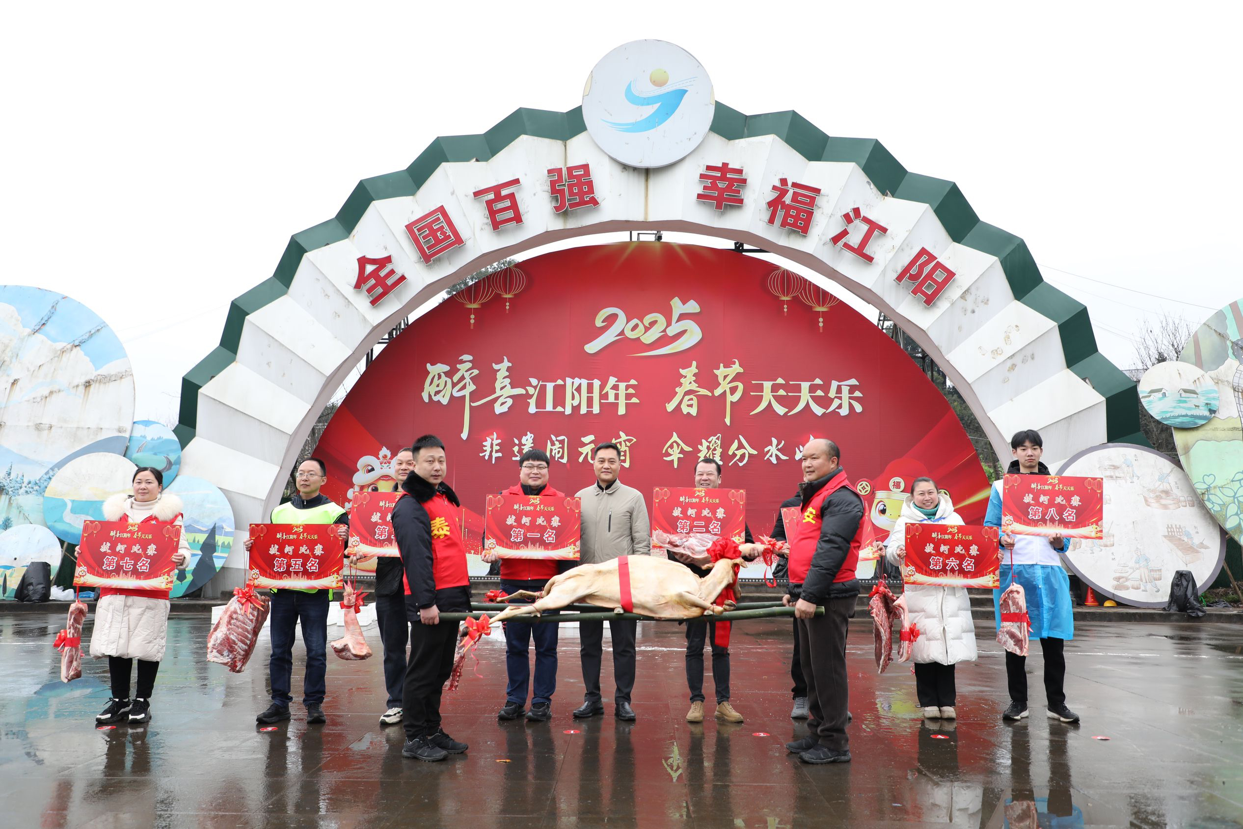 本次民俗文体活动为参赛队伍准备了独具农家特色的全羊、猪蹄、排骨、腿肉、五花肉等奖品,既经济实惠,又年味十足。最终,泰安街道代表队获得拔河比赛、“接福挑战赛”、旱地龙舟比赛冠军,来自丹林镇的选手获得“猪八戒背媳妇”比赛的冠军。