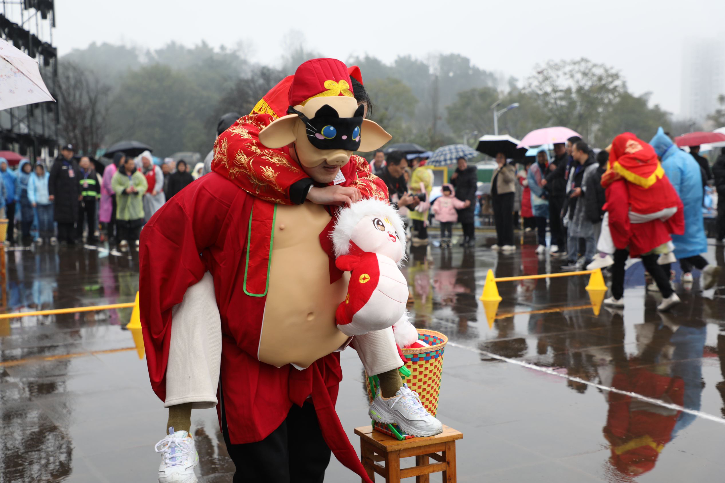 别具一格的“猪八戒背媳妇”比赛引得全场观众捧腹大笑。参赛的男士们头戴“猪八戒”面具,背着装扮成“媳妇”的搭档,在诙谐的音乐中跌跌撞撞地冲向终点。由于负重前行,不少选手在途中左右摇摆,甚至失去平衡摔倒,引得围观群众爆笑连连,掌声和欢笑声此起彼伏,充满了欢乐的气息。