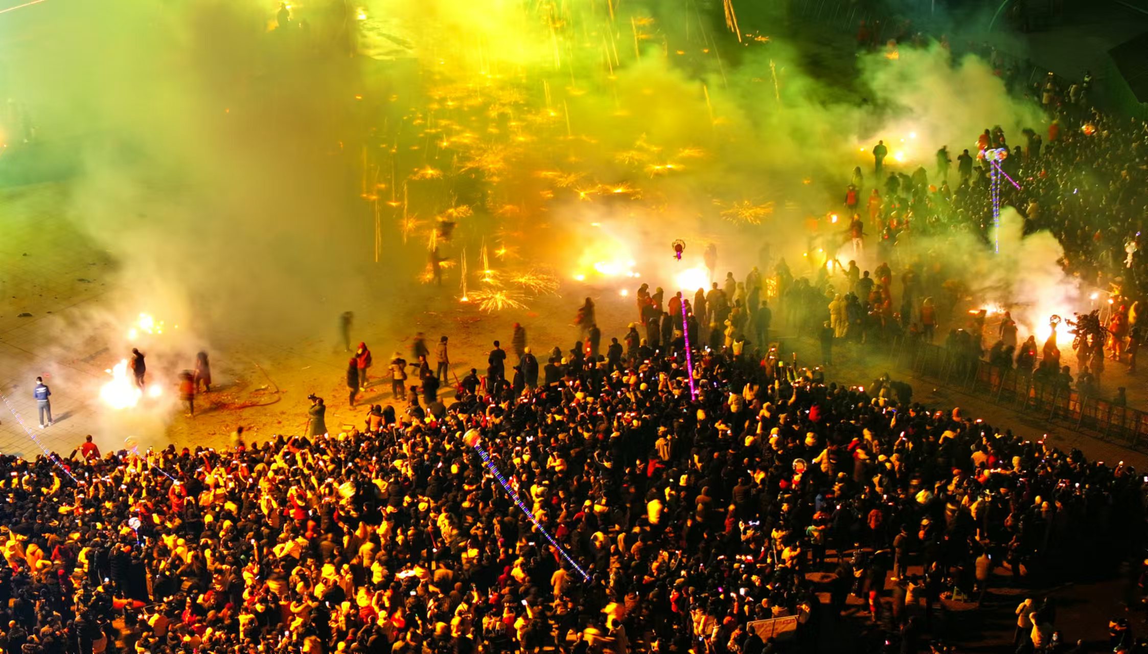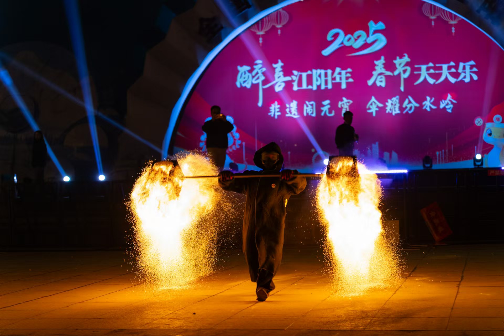 除了火壶,翻飞起舞的火棍与焰气附着的火刀也引得观众纷纷喝彩。充满气势的刀棍搭配熊熊烈火,一招一式间火龙萦绕,带动着无数烈焰纷飞。龙蛇起舞,流彩映空,一条条火龙随着刀棍跃动,与观众的惊呼声和掌声交织,汇聚成江阳元宵的浓浓年味。