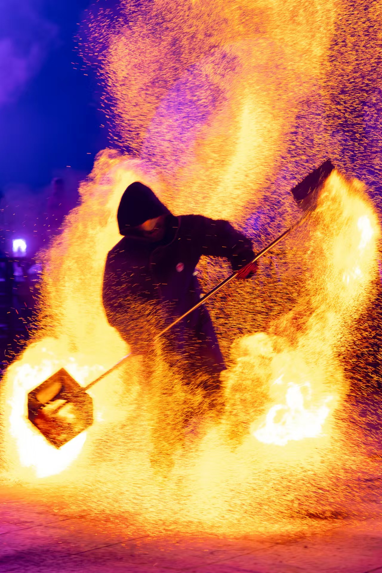 铁花夜放,火球映天。打铁花更是精彩纷呈。工匠师傅们将融化的铁水高高抛起、用力拍打,直击长空,刹那间激起层层飞花。壮观如密布星辰,耀眼如灯火流光,像是瀑布从高处奔涌而下,又像星河在夜空中流淌,炫彩夺目,美轮美奂。砸落在地面,铁水四散,激起遍地银花,为市民呈现出“火树银花不夜天”的壮丽美景。