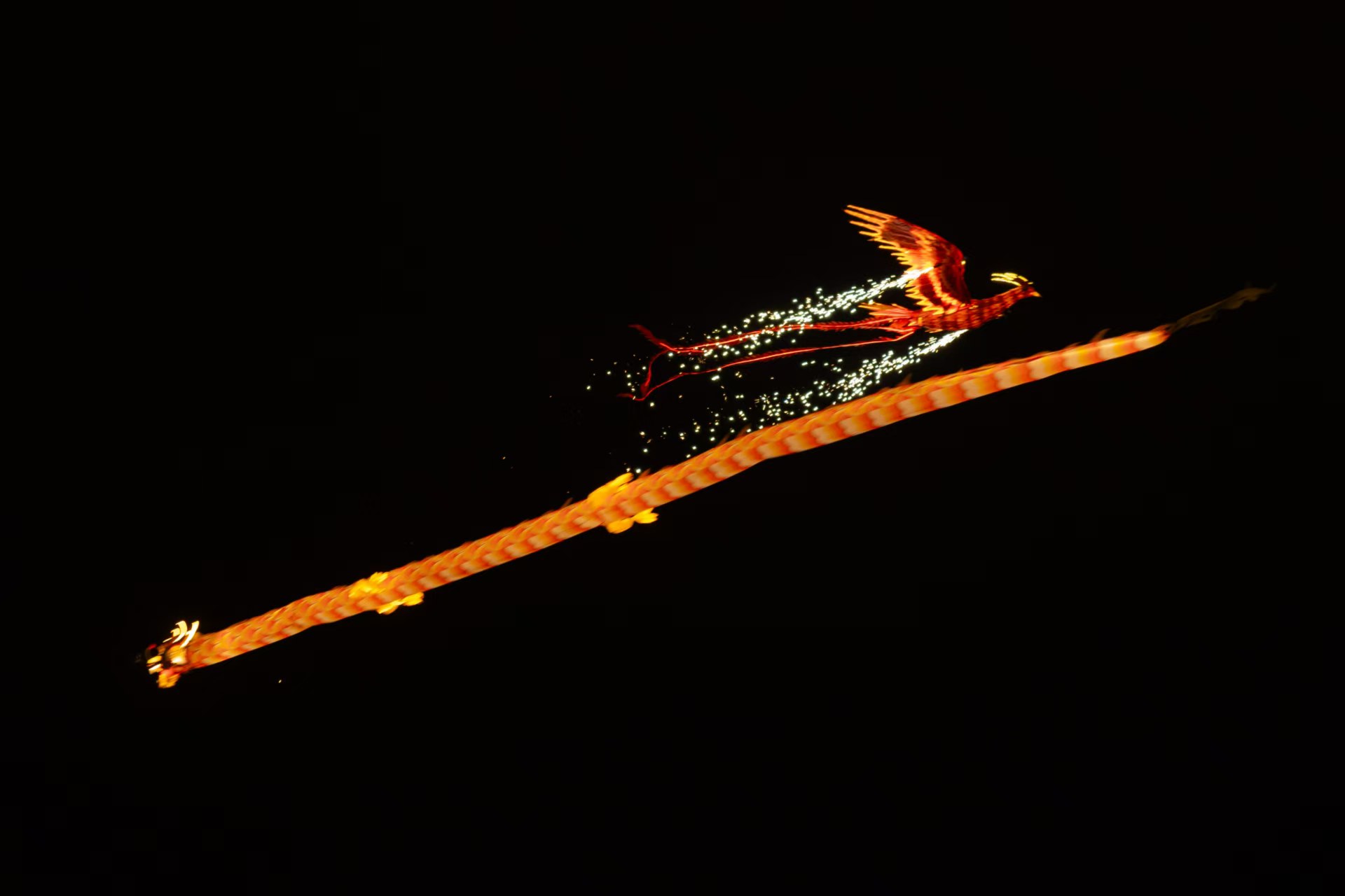 地上星火璀璨,夜空龙凤呈祥。随着一声惊呼,在众人的目光中,蔬式广场上空龙凤齐飞,鼓乐和鸣,祥龙玉凤在广袤的夜空里翩翩飞舞,时而并驾齐驱,时而你追我赶,婉转轻柔,澎湃灵动,将祝福与美好洒向人间。