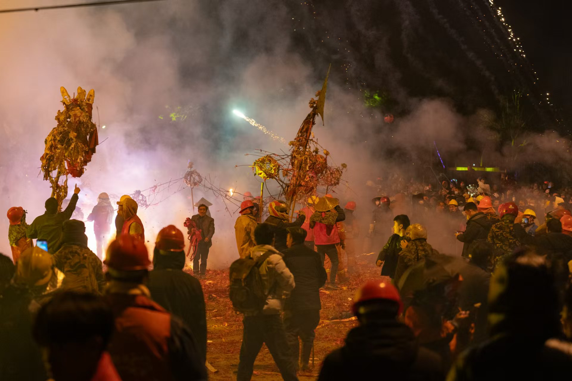 游龙洗巷,蜿蜒翻腾,在漫天烟火里,火龙上下翻飞,时而盘旋交缠,时而并驾齐驱,气势磅礴,动人心弦。骤雨珠碎鼓点密,锣镲乍响惊雷鸣,喧天锣鼓中,纸扎的火龙在人群中穿行,引得观众阵阵惊呼。青龙执春,万户安宁。在现场的欢呼声、烟火声、快门声里,人们祈祷着新年风调雨顺,万事祥和。