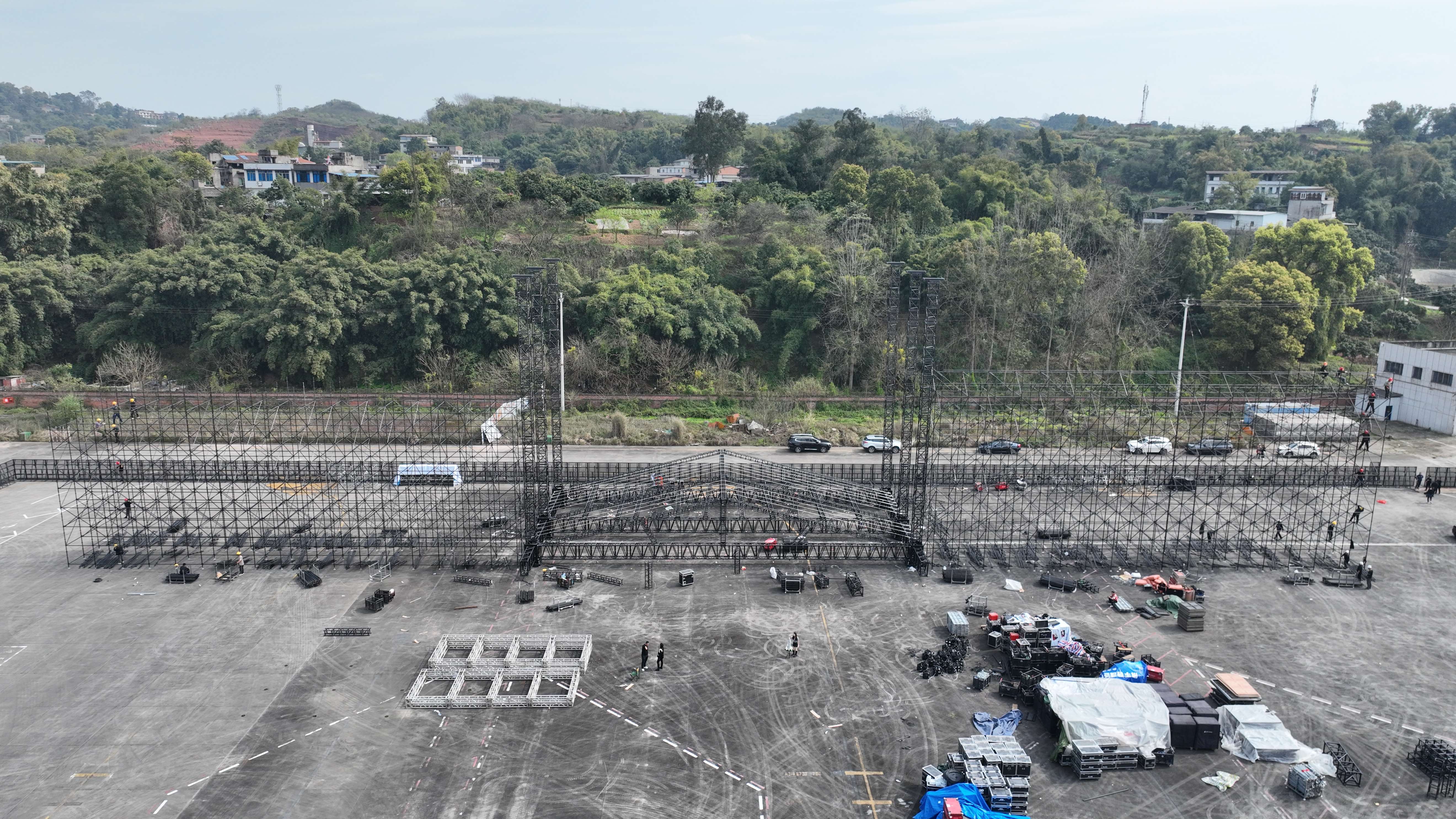 3月20日,记者来到蓝田机场看到,硕大的演出舞台正在搭建,工人们正在脚手架上进行着舞台框架的牢固工作。音控、软垫等设施已运输到位,待舞台框架搭建完成后,还将进行灯光、音响、LED屏安装调试等工作。