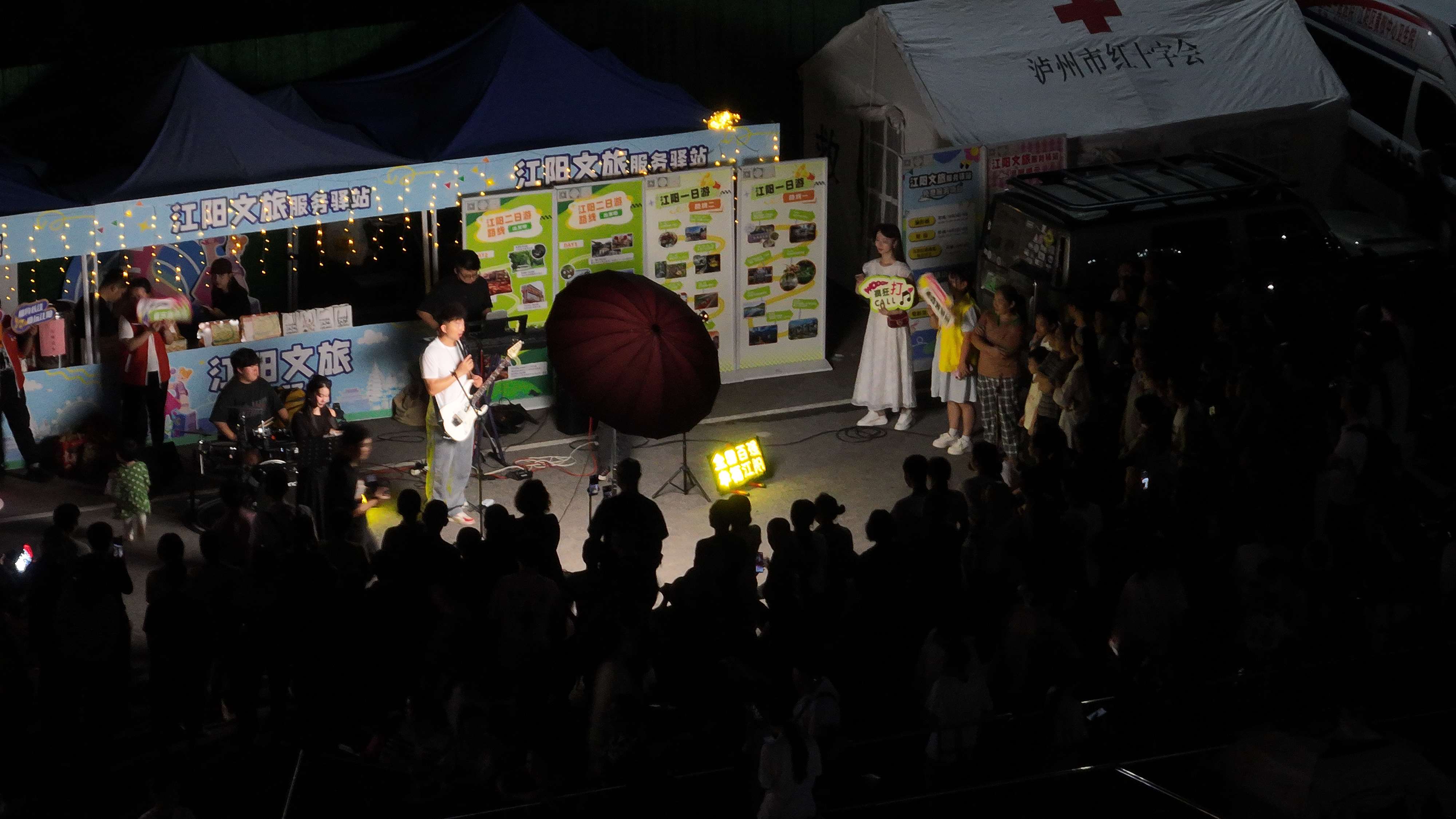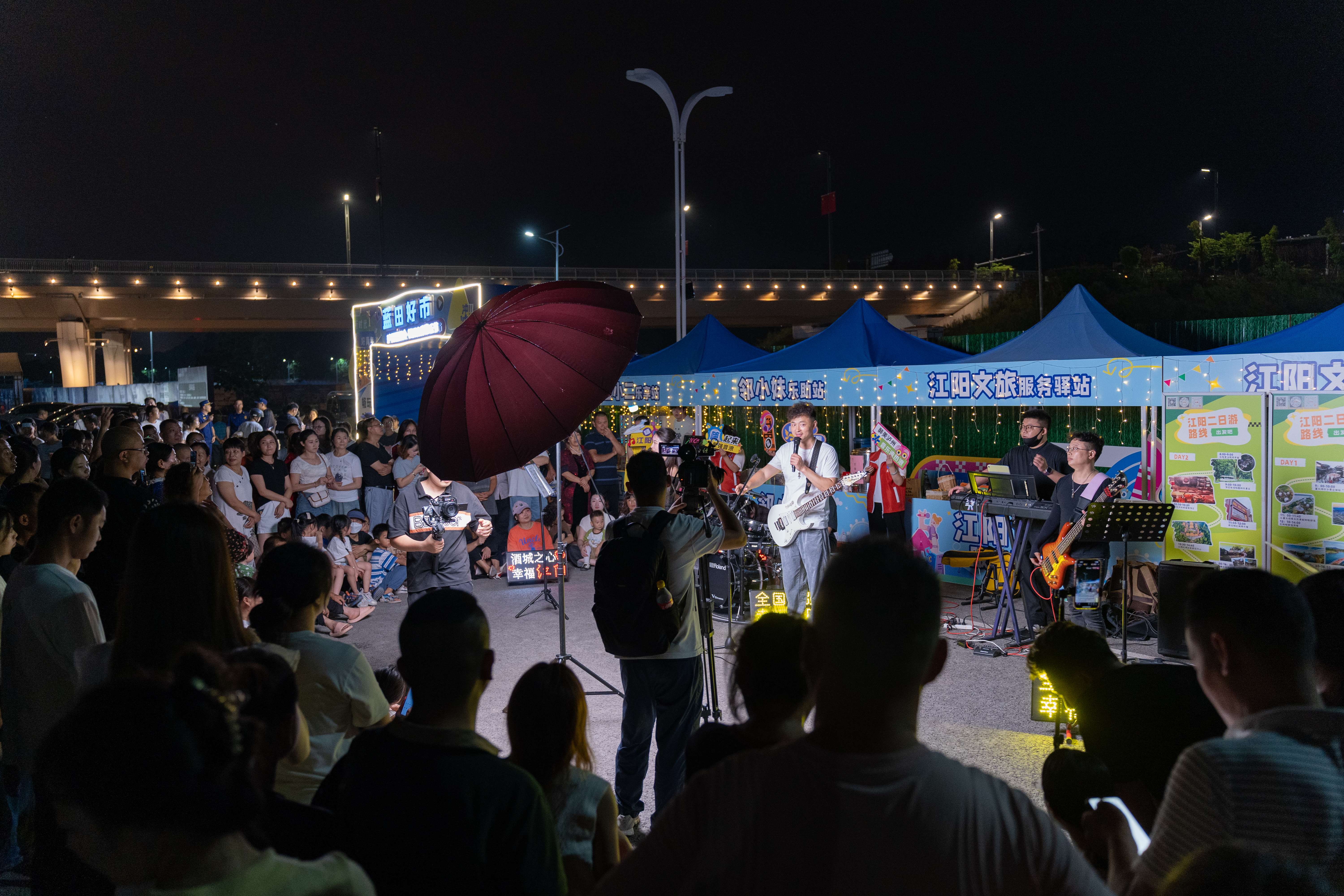 在江阳的服务驿站前,泸州本地的钰如意乐队正在演奏《酒城的风》《刚好你也在江阳》等泸州特色曲目,用音乐展示着酒城风貌、文化底蕴与城市魅力。与此同时,乐队还选取了当下流行的热门歌曲以及音乐节歌手的经典曲目进行演唱,为现场的乐迷们献上了一场音乐盛宴。