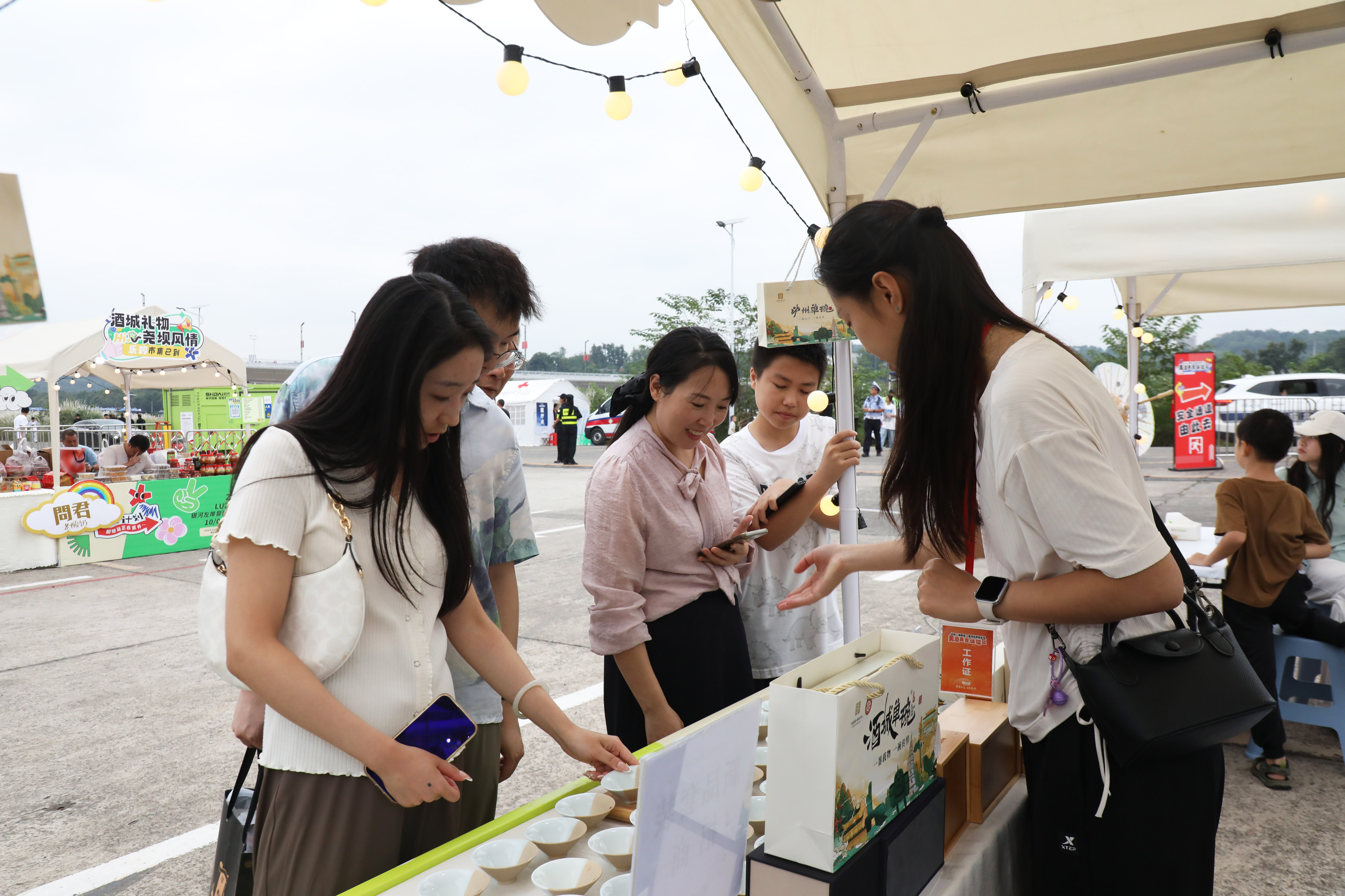 “风过泸州带酒香,来这里怎能不举杯共饮!”广西的刘先生与朋友开怀畅饮,尽兴而归。“现场聚齐了各种名小吃,白糕、黄粑、麻辣鸡我都品尝了,巴适得很。”山东的李冉冉用四川话称赞泸州美食烹香。文创产品同样备受青睐,江西大学生王同学爱不释手:“这些文创既传统又时尚,我要多带几件送给室友。”