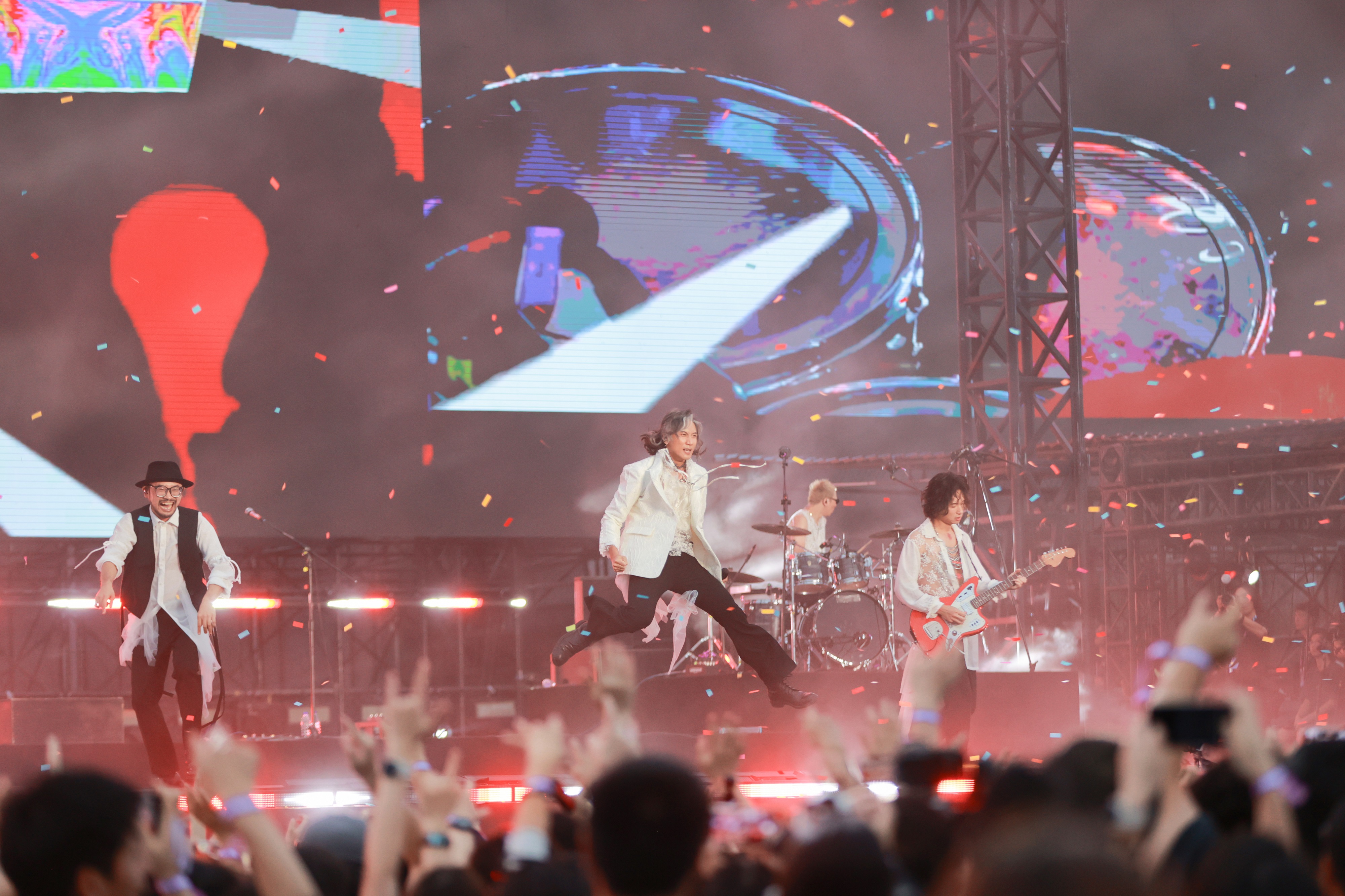 入夜后,万众期待的压轴乐队新裤子接棒舞台,闪亮登场,献上长达80分钟的精彩演出,乐迷们高举手中的灯牌,与舞台上愈发绚丽的灯光交相辉映,整个蓝田机场被五彩斑斓的光影笼罩。观众跟随节奏奋力跳跃,挥舞双手,尽情享受音乐狂欢,将气氛推向了最高潮。